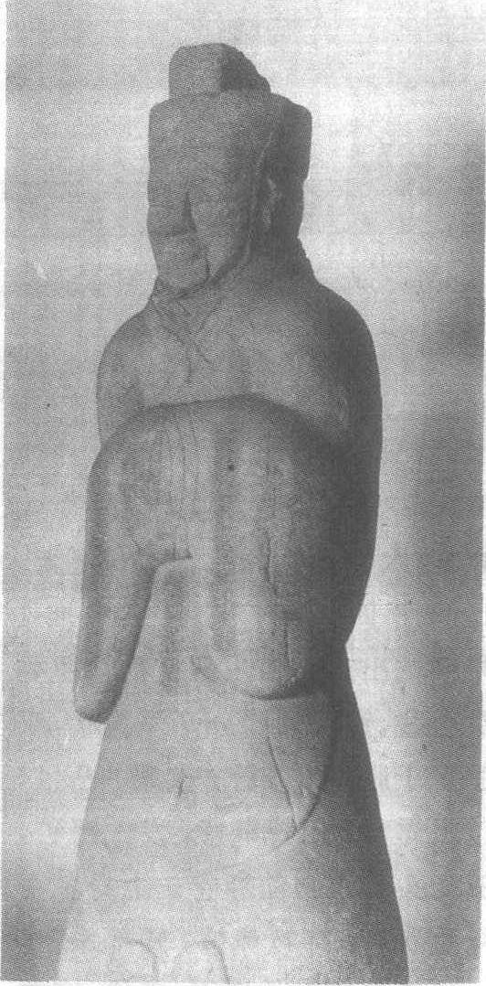 东汉建宁元年(公元168年)。高290厘米。1974年四川省灌县出土,灌县文物管理所伏虎观大殿存。整石雕成,重约四吨半,是用以测量水位的标记。李冰头上戴冠,冠带系颏下,身穿右衽长袍,袖手而立。其面部肌肉丰满,宽额挺鼻,微露笑意,意态雍容。两袖及衣襟上浅刻三行隶书: “故蜀郡李府君讳冰”、“建宁元年闰月戊申朔廿五日都水掾”、“尹龙长陈壹造三神石人水万世焉”。从此题记可知,这是东汉后期都水掾尹龙长陈壹所造的“三神石人”之一,曾任蜀郡守的李冰像。此像造型粗壮稳重,雕刻朴实洗练,线条简洁有力,为四川发现的最早的大型圆雕人像。它的发现,为研究都江堰的建堰情况,河道变化以及水文考古等提供了重要的历史资料。