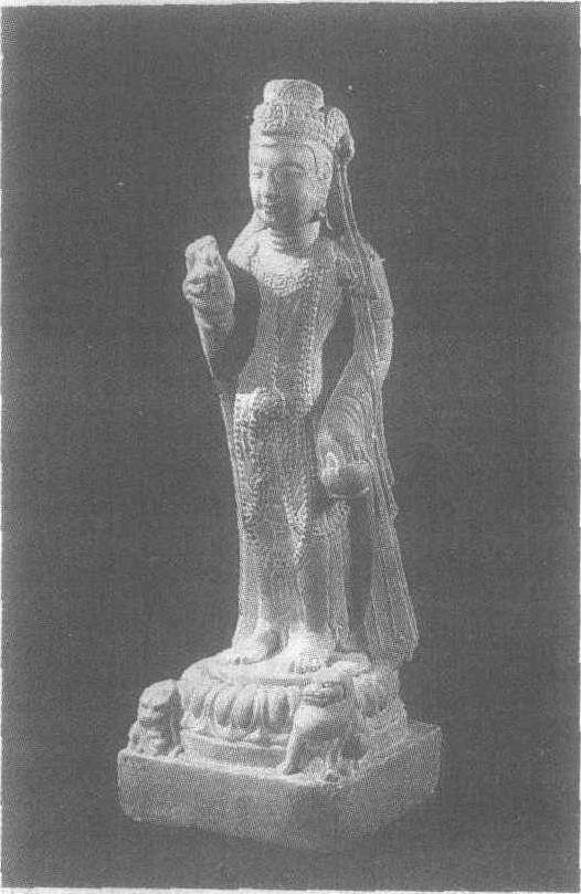 隋。通高44厘米。1963年陕西省蓝田县孟村出土,陕西省博物馆藏。汉白玉石雕制。菩萨头戴冠带垂肩的宝冠,通体饰满华丽的璎珞,右手执柳于肩际,左手握净瓶于胯旁,上身微后倾,赤足立于覆莲座上。座的左、右两旁雕一伏、一蹲的狮子。菩萨柳眉下弯,眼角上挑,微眯着眼凝视着远方,丰唇微翘,面相颇为端庄秀丽。