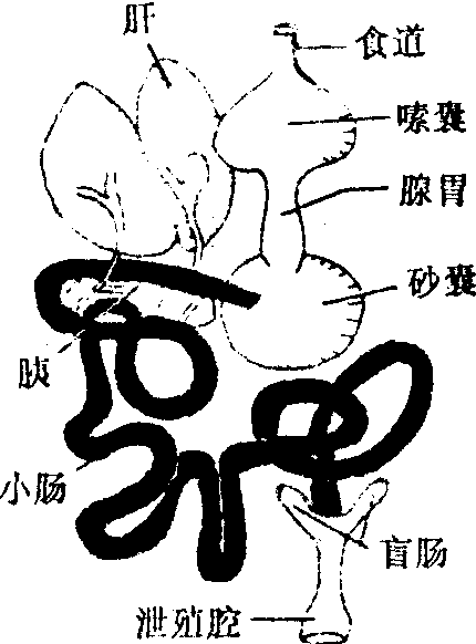 释义 | 砂囊shā náng指鸟类的胃,胃里贮有吞入的砂粒,用来磨碎食物。1909年钟观光《理科通证·动物篇·鸡》:“食道之一部扩大而成嗉囊,咽下之物至此暂停,有粘液使之软化。自此移入前胃,胃有厚壁,能分泄消化液,消化食物,未化者又移入于砂囊。砂囊又名筋胃,为扁球形之胃,外有强韧筋纤维,而内之粘膜变为角质,中藏砂粒,以助消化,筋肉收缩,则砂粒与食物相磨,能令粉碎状,与吾人捣米和以石粉无异。鸡常搔土吞砂而入之即以此也。”1922年杜亚泉、杜就田等《动物学大辞典·动物界之概略》:“鸟类: ……消化: 食物→口→食道→前胃→砂囊→小肠→大肠。” 动物的胃 动物的胃鸟胃:肶 膞 胗(鸡~) 胵(膍胵)肫 月奥 ☚ 器官2 翅膀 ☛ 砂囊 砂囊shanang(1)脊椎动物鸟类的胃分为前胃和砂囊两部分。砂囊又称“肌胃”。它前接前胃,后通小肠。砂囊常具有很厚的肌肉壁,胃腔较小。凡食谷类,坚硬果实以及杂食性的鸟类,其砂囊内面一般都有一层角质皮,囊内贮有吞入的砂石,用以代替牙齿磨碎食物,故称砂囊。但食肉性的鸟类(如鹰等),砂囊壁较薄,且无角质衬里。(2)无脊椎动物蚯蚓的胃壁肌肉也很厚,并有很强收缩力,能磨碎食物,故也称砂囊。( 图225 鸟类的砂囊 ☚ 前胃 腺胃 ☛ |