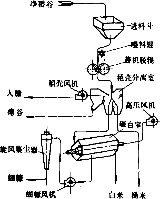 砻碾组合机combined rice sheller and polisher砻谷机和碾米机组合成一体的机器。由胶辊砻谷机、稻壳分离器和横式铁辊喷风碾米机组成,其工作过程及原理如图所示。稻谷从砻谷机进料斗经喂料辊加速,落入两辊之间工作区,谷粒借助两辊之间不同转速(线速差为2.5米/秒左右)相向转动所产生的挤压搓撕作用进行脱壳。脱壳后的砻下物进入稻壳分离器,利用风力将稻壳分出,得到谷糙混合物,直接进入碾白室,混合物在碾白室内,借助铁辊转动所产生的摩擦、擦离作用进行碾白和补充脱壳。同时在机内的高压风机喷出高压气流,促使米粒碾白和排糠。白米精度可由调节出米口压力门压铊的重量来控制。从出米口得到的成品大米可以直接进行打包。 以胶辊砻谷机胶辊规格为φ22.5×10厘米和铁辊喷风碾米机铁辊规格为φ8.5×33.5厘米的砻碾组合机,生产能力为500~600千克(标二米)/小时,配用动力10千瓦。有的砻碾组合机还带有谷糙分离设备。