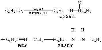 硝基苯在碱性溶液中,较易发生双分子还原,还原产物为氧化偶氮苯、偶氮苯、氢化偶氮苯:
