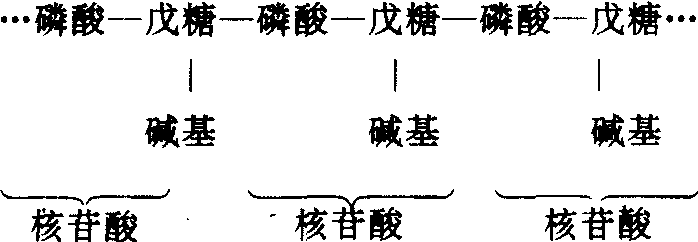 嘌呤碱和嘧啶碱或其核苷酸在一个核酸链上线性排列。