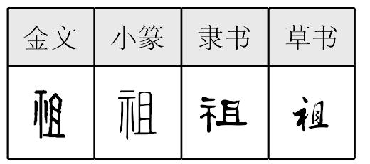 ❹ 不祧之祖|成佛作祖|光宗耀祖|呵佛骂祖|荣宗耀祖|数典忘祖 祖祖,甲骨文作    ,金文作    ,小篆作 。 本是 “俎” 的初文,今稱砧板,因借用爲先祖之 “祖”,故後世增 “示” 爲意符。“俎” “祖” 二字的初文或同形而表示異物,或因形音俱近而通用。 楚簡帛文作  ,或增虍聲。秦簡牘文作 ,古隸典型。參見415.宜字條。 祖 甲骨文; 金文 〈不從示,且字重見 〉; 篆zǔ[礻(示,祭神石桌,後用以表示“神祗”) +且(祖本字,聲意符)→祖(《説文》:“祖,始廟也。從示,且聲。”祖,祭祖的宗廟;父母以上的長輩〈祖父母、曾祖父母、高祖父母〉;事物的創始人〈鼻祖〉,魯班爲木工的鼻祖。)] 《詩經·小雅·甫田》:“琴瑟擊鼓,以禦田祖,以祈甘雨。”(彈琴撥瑟又擊鼓,禱告田神多保佑,求求上天賜雨露。) 祖祖zǔ(9画)