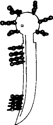 ☚ 奕奕名金 神术 ☛ 神刀满族萨满祭祀神具。亦称萨满刀。铁片制,清宫廷与民间均有藏品。沈阳故宫所藏铁神刀为乾隆年制,刀长74.7公分,刀上宽6.5公分,把宽10.2公分,无护手,把端呈圆形,上附铁连环6串,刀背上下附铁连环9串,每串4环。为朝祭时萨满所用之刀,请神和求福神之法器。 神刀即萨满刀,铁片制,清宫廷与民间均有藏品。沈阳故宫所藏铁神刀为乾隆年制,刀长74.7公分,刀上宽6.5公分,把宽10.2公分,无护手,把端呈圆形,上附铁连环6串,刀背上下附铁连环9串,每串4环。为朝祭司祝祝祷所用铁神刀,请神和求福之法器。 |