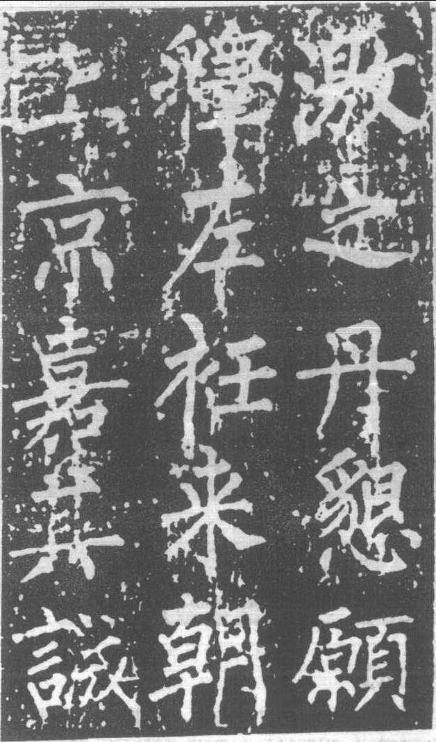 神策軍碑 (局部) 唐·會昌三年(843)刻。崔鉉撰,柳公權書。正書,行字未詳。記武宗 (李炎)巡幸左神策軍事。張彦生謂為“公權七十一歲書,比 <玄秘塔碑>更為精練蒼勁。”原石已佚,且因立碑于皇宫禁地,不能隨便椎拓,故拓本流傳極少。原碑拓本分裝兩册,據宋趙明誠《金石録》,下册早已失傳,上册僅至 “來朝上京嘉其誠”之 “誠”字止,為碑文之前半,以下全缺。今北京圖書館所藏宋拓孤本,曾屢經遞傳,上有賈似道、元朝國史院、明内府、晉王府、孫承澤、梁清標、安岐、陳介琪等題署。鎸刻精工,雖是拓本,無异真迹,為今所傳柳公權書中最佳者之一。文物出版社等有影印本。二戰前日本曾復製。 |