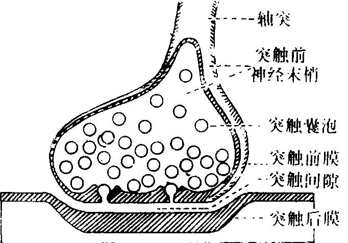 释义 | 神经元间的信息传递 神经元间的信息传递兴奋在一个神经元内,例如从细胞体传导到轴突末端,是以电信号的形式进行传导的。但在神经元之间,即一个神经元兴奋引起另一个神经元兴奋,则不是这么简单,大多数情况下是要通过化学物质做中介的,因而称为“传递”。就好像400米接力跑时,前一个运动员必需将接力棒递给后一位运动员才起作用一样。为什么神经元之间的传递这么复杂?这是因为神经元之间是有一定间隙的,它们之间在结构上不是直接连接的,一个神经元的电变化一般不能直接传导到第二个神经元。神经元之间的传递必需通过一种称做“突触”(见图1.12-4)的特殊结构处。在这里,两个神经元之间的间隙(突触间隙)很小,间隙两侧的神经元膜均增厚,其中一侧称为突触前膜,另一侧为突触后膜。兴奋总是从突触前膜所在的神经元传递给突触后膜所在的神经元。因为突触前膜内有贮存化学传递物质的小泡,当该神经元的兴奋以电信号的形式传导到这里时,小泡移向突触前膜处并破裂释放到突触间隙(电信号转变为化学信号),经突触间隙弥散至突触后膜处,可与突触后膜上的受体相结合,再引起突触后膜所在的神经元出现电信号(化学信号转变为电信号),因而,兴奋经过突触传递时与在神经纤维上的传导不同,比较复杂,除了有电信号外,中间还要经过化学物质做中介。 图1.12-4 突触结构模式图 ☚ 神经纤维 神经递质 ☛ |