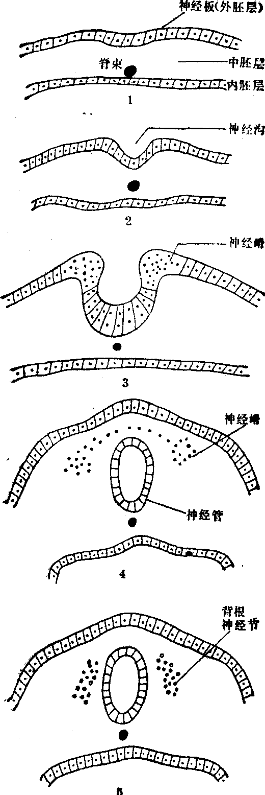释义 | 神经系统发育及发育障碍 神经系统发育及发育障碍神经系统于生后最初数年内发育较为迅速,与身体其他系统相比,占据领先地位。小儿神经系统的发育与发育障碍分述如下。 神经管的发育过程 (2) 不完全颅骨裂: 骨裂大多位于中线,以枕部为最多见,也可于额部、鼻根或颅底。一般均有包括脑膜、脑组织以至脑室的膨出,膨出物可大可小,随颅压高低而有变化。膨出物的基部可以较宽,亦可呈蒂状,触之质软。若体积小可回缩入颅腔,并能摸及骨的边缘。常伴其他畸形如脑积水,脊柱裂、唇裂、腭裂等。治疗以手术修补为主。 (3) 脊柱裂: 是脊椎骨棘突及椎板的先天缺损,有时伴有椎体及椎间孔发育畸形。临床有以下几型: ❶隐性脊柱裂: 常见于腰骶部,由于一个或几个椎骨的椎板未完全闭合,但不伴椎管内容物膨出。局部皮肤可正常,也可有毛发增生、色素沉着、或皮肤凹陷等异常. ❷脊膜膨出及脊膜脊髓膨出: 以腰和腰骶部多见,脊膜膨出者,其膨出物为脊膜及脑积液。哭吵,用力时膨出物紧张,透光试验阳性。脊膜脊髓膨出者较为严重,除脊膜及脑脊液外,脊髓或神经根亦进入膨出的囊内,故透光试验阴性。 ❸脊髓外翻: 为脊髓中央管裂开直达体表,形成暴露的肉芽,脊髓本身亦暴露于外,脑脊液经常外漏,此型更为严重。 隐性脊柱裂一般无症状,多数于成年期因腰痛X线腰骶摄片时才发现。其他几型的早期症状为走路延迟,步态笨拙,膝关节以下肌肉发育差; 肌力弱,踝反射消失或减退,偶有遗尿或尿失禁。畸形严重者于相应节段产生症状,如肢体无力或瘫痪,感觉缺失,下肢皮肤营养障碍,大小便失禁等。若膨出的囊肿皮肤溃破,或隐性脊柱裂伴有皮肤窦道,则可感染而引起脑膜炎。脊柱裂患者可伴脑积水、兔唇、裂腭、脊髓空洞症等或脊髓内畸形。 隐性脊柱裂一般不需手术,如出现症状时应即手术,如分离或切除束窄之带,或作减压术或切除压迫之肿块。脊膜及脊膜脊髓膨出者,有主张于生后2~3天手术,早期手术之优点为提高存活率及减少由于病变给将来生活带来的不便,但对严重病例则手术至少于生后一个月施行,皮肤窦道必须切除以防止脑膜感染。 尾部神经管发育与异常 神经管的尾部并不形成神经管道,该处细胞与脊索相接触后增殖为一大堆未分化细胞称尾部细胞群向尾部继续伸延形成尾摺,该处尚有其他胚胎组织如中肾、后肠。于尾部细胞群中出现多个小空泡,后小空泡逐渐融合成大的空泡,当这些空泡与形成过程中的神经管道中央管相接通时称管道沟通,此后管腔壁的细胞为中心向四周分化成为室管膜细胞。 胚胎40天,管道沟通过程中形成的管子由于细胞的坏死及萎缩开始退行性分化而变为一根纤维组织的索带,称终端丝,位于脊髓中央管内。终端丝的近端段称为终室及退化的室管膜腔,其远端段为神经尾端遗迹。 神经管及脊椎骨之发育均以节段为标记,故二者有相互关系。该处发育畸形有: (1) 脊髓囊肿: 为脊髓中央管的局限性扩张,常伴有共泄腔外翻、脊柱畸形及肢体感觉及运动功能障碍。 (2) 腰骶部脂肪瘤: 有二种,一种为单纯性脂肪瘤,不与硬脑膜相通; 另一种为脂肪脑膜膨出,系皮下脂肪肿块与硬脑膜腔相接,肿块所在部位可压迫相应组织产生神经症状。 (3) 腰骶部脑脊膜膨出。 (4) 骶前脑脊膜膨出: 由骶椎发育缺陷所致,以女孩多见。膨出的脑脊膜位于骨盆,于直肠之后。常见症状为慢性便秘及囊肿压迫盆腔其他脏器所产生的症状。手指肛检可发现骶前区有肿块。X线摄片示骶骨畸形,脊髓碘油造影发现碘油进入囊腔。 前脑发育与异常 神经管形成后,其头端增大发育成为原始前脑(以后成为端脑及间脑)、中脑及菱脑(以后成为后脑及末脑),而其后半部仍保留管样结构,以后发育成为脊髓。 胚胎22天,头摺高起并向二侧扩展形成视沟,以后发育为视凹陷,34天时前脑已分成端脑 (大脑半球) 及间脑。胚胎37天时可分出海马回及纹状体基质,嗅球位置已由嗅凹与端脑间的细胞标记出来。间脑分化成为丘脑及乳状突出的原基。胚胎40天时于前脑的局部可见丰富血管,即为将来的脉络丛。大脑半球迅速发育,与中脑有重叠。胚胎45天,间脑分化更为明显。胚胎47天视交叉原基部位有视纤维发育。约于胚胎50天大脑半球仅为薄薄的一层组织,靠终板将二侧半球相连接。约于胎儿6个月时大脑表面已可见到一些脑沟及脑回,额、顶、枕叶已可辨清。至7个月时大脑表面的主要脑沟、脑回已基本看到。 端脑发育成为大脑二半球、纹状体及侧脑室。间脑发育成为第三脑室的脉络丛、丘脑、松果体、韁核、大脑后联合、视交叉、灰结节、垂体后叶,乳头体及内、外侧膝状体等。 前脑发育过程中可发生的畸形有 ❶脑回畸形: 如无脑回、脑回变大,脑回过少或有数目较多的小脑回。 ❷脑穿通畸形: 脑室与蛛网膜下腔之间有异常通道。 ❸无大脑皮层畸形。这些畸形用一般检查方面不易查出。前脑发育畸形于体表上或通过简单检查可以作出诊断者有二种: ❶全前脑畸形(Holoprosencephaly) 发生于胚胎发育早期,有数型,最简单的为单侧或双侧无嗅囊 (又称无嗅脑畸形),大脑半球未分成二半,故脑室只有一个,无透明隔及胼胝体。常伴面部特征,如二眼距离较近、中央性唇裂、人中发育不良等。 ❷水脑畸形(Hydraen-cephaly),此畸形发生于胚胎发育的后期,由脑血管畸形、血栓形成、感染