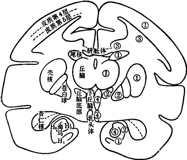 (3)边缘系统: 缺氧性脑病和铅毒性脑病损害边缘系统皮质的神经元时,可出现精神障碍,如缺乏克制力、情绪易变等。其次,引起全身抽搐的毒物,可能是作用于边缘系统(主要为海马)所致。此外,海马乳头体系统病变与记忆的缺失有关。