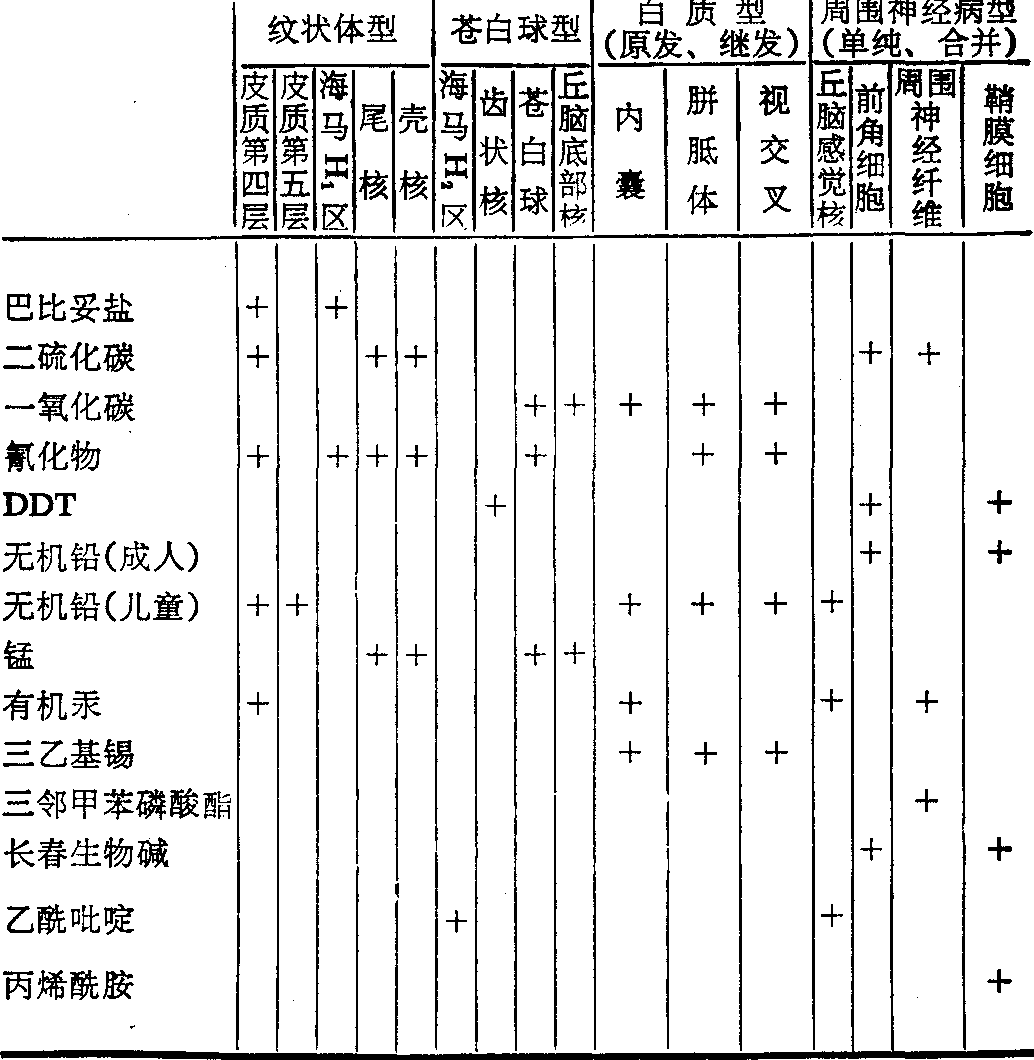 毒物选择性损害 这类毒物的毒作用复杂,中毒机理各异。其中多数可引起中枢神经系统和周围神经系统的混合型病变,如有机汞、异烟肼等。根据神经系统器质性变化的类型,这类化学性损害大体可分为以下四种。