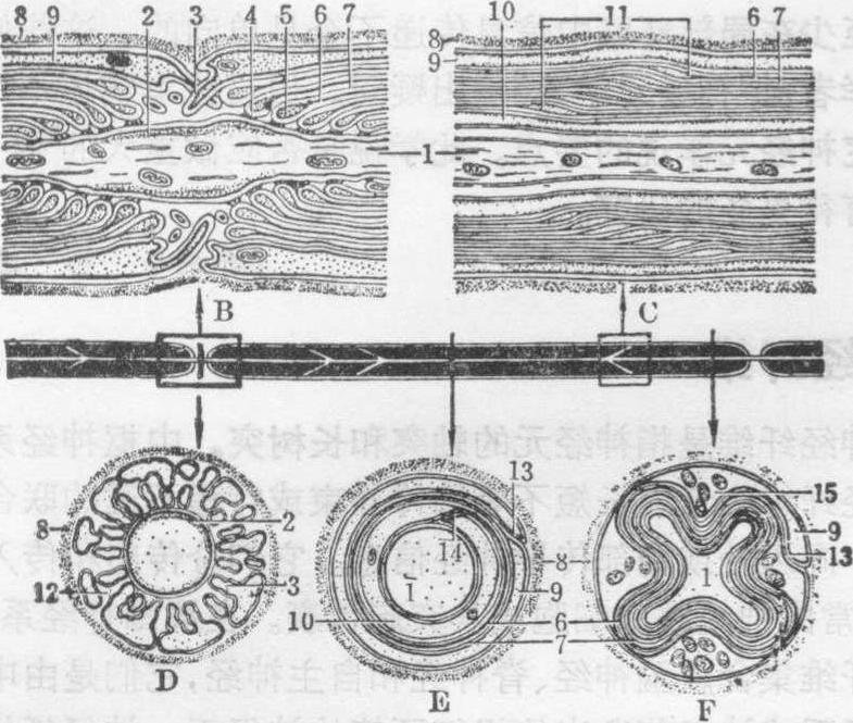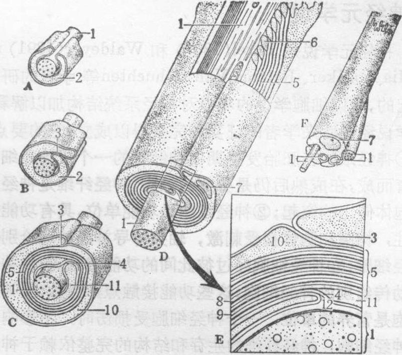 释义 | 神经纤维 神经纤维神经纤维是指神经元的轴突或感觉神经元的长树突而言。在中枢神经系统中,集合成束的神经纤维称为神经束(或传导束),神经束集合的部位色泽亮白,称为白质;而在周围神经系统中,集合成束的神经纤维称为神经,例如坐骨神经、迷走神经等。体内的神经纤维在结构和粗细上是有差别的,有些神经纤维外面包有一层含脂质较多的髓鞘,称为有髓纤维;有些则没有,称为无髓纤维。由于神经纤维的直径不同,又可将神经纤维分为粗纤维和细纤维。但不论哪种神经纤维都可传导兴奋,因而神经纤维的机能是传导信息的。有些神经中的神经纤维,来源和功能是相同的,例视神经(全部来自视网膜,都是感觉神经)和舌下神经(全部来自延髓,都是支配舌肌运动的),但多数神经是混合的,即其中既有传入的感觉纤维,又有传出的运动纤维。但因为神经纤维传导兴奋时互相是绝缘的,不同的纤维虽然组合在一起,但各自仍可完成独立的机能。不同神经纤维传导兴奋的速度是不同的,有髓纤维传导快,无髓纤维传导慢;粗纤维传导速度快,细纤维传导速度慢。体内传导速度最快的有髓运动神经纤维可达100米/秒,而传导速度最慢的无髓细纤维却小于1米/秒。由于神经纤维传导兴奋信息是以电信号的形式沿着神经纤维膜进行的,因而可用电学仪器对其传导速度进行测量。人上肢正中神经内运动神经纤维和感觉神经纤维的传导速度分别为58米/秒和65米/秒。当周围神经发生病变时传导速度减慢。因此测定传导速度有助于诊断神经纤维的疾患和估计神经损伤的预后。 ☚ 神经胶质细胞 神经元间的信息传递 ☛ 神经纤维neurofibrae动物神经细胞的突起。大多外包被鞘。中枢神经系的神经纤维构成长短不等的传导束或行程不远的联合纤维,由少突胶质细胞包被或无包被而裸露。周围神经系的神经纤维集合成脑、脊神经和自主神经,外被许旺细胞和网状纤维及结缔组织。依功能和神经冲动传导方向,分为传入(感觉)及传出(运动)纤维。前者向中枢神经系传递刺激信息,后者传递中枢神经系的神经冲动到机体各处的肌肉、腺细胞等。据包被神经纤维的胶质细胞是否形成髓鞘,分为有髓神经纤维和无髓神经纤维。 神经纤维 神经纤维shenjingxianwei由神经元的轴突构成。神经元一般有一条长而分枝少的轴突,几条短而呈树状分枝的树突。有的神经元的树突只有 一条,而且比较长。由神经元的轴突或长的树突以及包裹在轴突外的髓鞘构成有髓鞘纤维。还有 一种无髓鞘纤维,仅由神经元的轴突和树突二者构成。髓鞘绝缘性很高,有规则地分节段地形成。按传导兴奋的方向不同,又可把神经纤维分为两类:一类是把兴奋从外周传向脑、脊髓的传入神经纤维,也叫感觉神经纤维; 另一类是把兴奋从脑、脊髓传向外周的传出神经纤维,又叫运动神经纤维。不同的神经纤维,其长短粗细也很不相同。短的极短,长的可达1米左右。细的直径仅有1~2微米,粗的直径可达数百微米。(陈正宜 于慧颖)神经末梢 (shenjingmoshao) 神经纤维末端的细小分枝,分布到全身各处,是周围神经系统的末梢部分。神经末梢可分两类: 一类是传入神经纤维末梢,常终止于感觉器官,又叫感觉神经末梢;另一类是传出神经纤维末梢,终止在肌肉或腺体,又叫运动神经末梢。感觉神经末梢能感受体内、外环境的各种刺激,并能将产生的神经冲动向中枢神经传导。它包括游离神经末梢、触觉小体、环层小体等。运动神经末梢,可接受由中枢神经传来的冲动,引起肌肉收缩或腺体分泌。例如,运动终板即是使骨骼肌发生收缩运动的神经末梢。 ☚ 神经元 神经胶质细胞 ☛ 神经纤维 神经纤维shenjing xianwei神经元的轴突若为髓鞘和神经膜包被,或仅为二者之一包被,则称为神经纤维。但一级感觉神经元属例外,它的周围突传导来自感受器的信息,在功能上起树突作用,但感觉神经元的周围突随周围神经行走,大多数亦有髓鞘和神经膜,也称为神经纤维。神经纤维可分为有髓和无髓两类。神经纤维的粗细主要决定于髓鞘的厚薄, 而神经纤维的直径大小则直接与其传导冲动的速度有关, 一般的直径越大传导越快。 ☚ 轴突 神经末梢 ☛ 神经纤维nerve fiber神经元胞浆突起的延长部分,外面由鞘状结构所包绕,叫神经纤维。神经纤维中又分为有髓纤维和无髓纤维。有髓纤维是轴突延长部的外面被胶质细胞反复包裹(形成鞘)而成;无髓纤维仅被雪旺细胞包裹,不反复包绕或包绕或包绕不全。神经纤维分布到人体所有器官和组织间隙中,其主要功能是对冲动发生传导。传导的速度很快,每秒2~120m,传导的过程是以生物电的形式进行的。神经纤维按其分布可分中枢性与周围性纤维;按其功能可分运动性(传出)和感觉性(传入)纤维;按其结构可分为有髓和无髓纤维;按其直径大小和传导速度又分为A、B、C3型纤维。总之,各神经纤维在构造和功能上有些差异,但其基本功能相同。 神经纤维神经元的长突起(轴突或长树突)和包在它外面的神经胶质细胞(雪旺氏细胞或少突胶质细胞)构成的纤维状结构。有两种:1.有髓神经纤维,突起外面包裹髓鞘和神经膜,并有节段性,两节之间的间隙称郎飞氏节。冲动的传导是从一个郎飞氏节跳到另一个郎飞氏节,故传导速度较快。2.无髓神经纤维,突起外只有神经膜而无髓鞘,纤维较细,传导速度也慢。 神经纤维 神经纤维指神经元胞浆突起