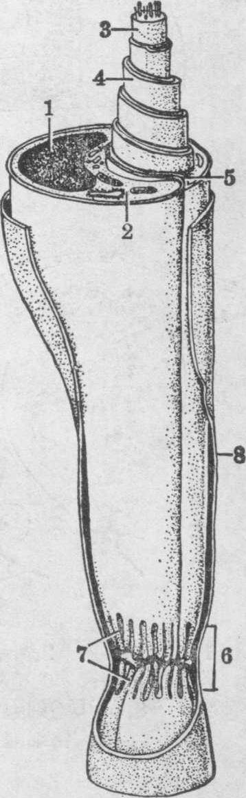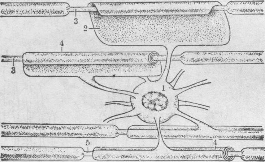 释义 | 神经纤维髓鞘的发生 神经纤维髓鞘的发生神经纤维髓鞘是包卷于轴突外方的细胞性神经膜及其分泌的髓素所形成的结构。中枢神经系统神经纤维的细胞性神经膜为少突胶质细胞,在周围神经系统则为Schwann细胞。这二种细胞均可分泌髓素,形成髓鞘。髓鞘生成由近细胞体处开始,然后沿轴突渐扩伸至末端。人胚神经纤维髓鞘的发生开始于第4月,而完成于初生后第2~3年。髓鞘化出现时间因神经的类型而异。中枢神经系统出生后仍有大量髓鞘继续发生。髓鞘形成时间通常与神经系统的功能成熟及其种系发生上的早晚有关,例如人中枢神经系统控制随意运动的主要下行通路,其神经纤维髓鞘在出生时开始形成,到婴孩能行走时才完成。 图1 周围神经纤维髓鞘的发生 1.轴突 2. Schwann细胞 3.轴突系膜 4.外轴突系膜 5.内轴突系膜 6.主致密线 7.周期内线 8.外层胞质 9.内层胞质 周围神经纤维髓鞘的发生 周围神经的髓鞘是由Schwann细胞缠绕轴突形成的。神经嵴迁移来的Schwann细胞先成串地附着在轴突上。每一Schwann细胞与轴突相贴处均凹陷成一纵沟,轴突乃陷入此纵沟内(图1,A),沟缘两侧的细胞膜互相合并形成轴突系膜 (图1,B)。这样,轴突便完全被Schwann细胞包裹。随后,轴突系膜变长,并绕轴突包卷许多周(图1,C、D)。原在轴突系膜间的胞质被挤至细胞的内、外表面和上、下缘,以致各层系膜的胞质面互相合并,构成较粗的主致密线; 而系膜内,即两层胞膜外表面合并处则形成较细的周期内线,或称周期间线(图1,D)。因此,系膜包卷轴突的结果乃形成粗线(主致密线)和细线(周期内线)相间排列的螺旋板层结构,这就是髓鞘。故髓鞘是Schwann细胞的双层胞膜(即系膜)绕卷轴突层叠形成,每一Schwann细胞所形成的髓鞘节段称为结间体,相邻结间体之间无髓鞘包裹轴突的缩窄部位称Ranvier结(图2)。Schwann细胞的表层胞质也在靠近Ranvier结处增多,并向Ranvier结区伸出许多指样突起,与相邻Schwann细胞的指样突起嵌合,覆盖Ranvier结区 (图2)。Schwann细胞外面附有基膜,此基膜形成连续的一层,包裹有髓神经纤维外面,称神经膜管。 图2 周围有髓神经纤维立体图解 1.Schwann细胞胞核 2.Schwann细胞胞质 3.轴突(内含微管及神经丝) 4.髓鞘 5.外轴突系膜6.Ranvier结 7.Schw-ann细胞的指样突起 8.基膜(神经膜管) 中枢神经纤维髓鞘的发生 中枢神经系统有髓纤维的髓鞘由少突胶质细胞形成。少突胶质细胞突起末端扩展呈扁平薄膜绕卷轴突许多周(图3),薄膜内的胞质被挤至边缘。因此,除边缘处含有胞质外,其余均无胞质,胞膜的胞质面互相贴合形成较粗的主致密线,胞膜外表面贴合形成较细的周期内线,这和周围神经纤维髓鞘发生一样,形成了粗、细线相间排列的髓鞘板层。髓鞘板层两端亦因含胞质而形成胞质囊(即胞质索)贴附在轴膜上,但与周围神经纤维髓鞘的发生有下列不同点: ❶一个少突胶质细胞可藉其伸出的多个突起,形成不止一条神经纤维的髓鞘结间体,少突胶质细胞含核的细胞体位于神经纤维之间; ❷髓鞘内、外表面的胞质很少,结间体内也无Schmidt-Lantermann切迹; ❸Ranvier结区无指样突起覆盖; ❹神经纤维外面无基膜,即无神经膜管的形成。 图3 中枢神经纤维髓鞘的发生 1.少突胶质细胞 2.少突胶质细胞的扁平薄膜突起 3.轴突 4.髓鞘 5.Ranvier结 ☚ 神经嵴的发生与分化 脊髓的发生 ☛ |