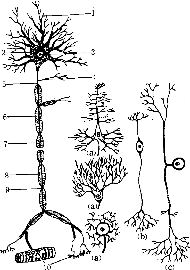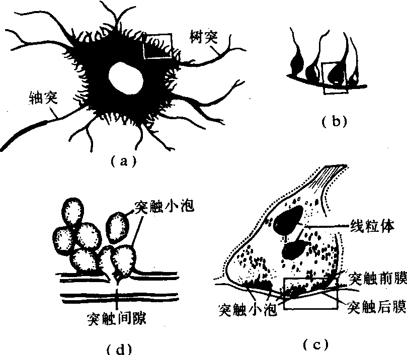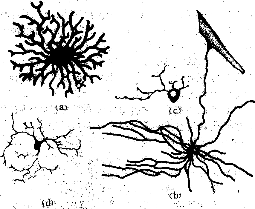 运动神经末梢 为运动神经元的外周支末梢部分。它和相连系的器官组织(肌肉或腺体)的接触点构成效应器。如分布于骨骼肌的运动终板。其结构类似于神经元的突触。运动神经纤维入肌纤维而失去髓鞘,并反复分支,末端膨大,附着肌细胞膜上。其神经纤维的细胞膜构成突触前膜,膨大部有许多含乙酰胆碱(神经递质)的小泡、线粒体和微丝等; 突触后膜是肌细胞膜,它形成许多皱襞以增加受体数量,两者间的间隙为突触间隙。内脏传出神经的节后纤维分布于平滑肌、心肌和腺体上构成的效应器,结构简单,其分枝状末梢膨大呈扣结状或网状,与相应组织相接触。 神经胶质细胞 种类很多,分布在中枢神经系统中的有星形神经胶质细胞、少突神经胶质细胞、小胶质细胞和室管膜神经胶质细胞4种,分布在外周神经系统中的有神经膜细胞和卫星细胞2种。它们各具不同的形态和功能(图4)。 图 4 神经胶质细胞 (a) 原浆性星形胶质细胞; (b) 纤维性星形胶质细胞;(c) 少突胶质细胞; (d) 小胶质细胞 星形神经胶质细胞 呈星形,胞体大,核较大,圆形或椭圆形,它又有两种形态,一种突起细而长,分支少,表面光滑、胞质内有许多交织排列的胶质丝称纤维性神经胶质细胞; 另一种突起较粗短,表面有许多芽状分支,细胞质多而胶质丝少,称原浆性星形胶质细胞。前者分布于脑和脊髓的白质,后者分布于灰质。纤维性星形胶质细胞有的末端形成脚板状,附着于毛细血管壁上,有的突起则包绕于神经纤维上,故对神经元起着营养、排出代谢产物和支持作用。 少突神经胶质细胞 比星形胶质细胞小,核圆形,胞质少,突起少,分支也少,有的突起顶端成宽叶状,包绕于神经元轴突外形成髓鞘。 小胶质细胞 呈长梭形或不正形,胞体小,从胞体发出带有小棘的分支,核小,长圆形或三角形。它具有吞噬能力。是神经系统中唯一起源于中胚层的细胞。 室管膜细胞 被覆于脑室和脊髓中央管表面,为单层柱状细胞。有的表面有微绒毛,有的有纤毛,有的基底面有一条细长的突起,伸向深部。 神经膜细胞 又称雪旺氏细胞,包绕在轴突外面形成髓鞘和神经膜。 卫星细胞 呈扁平形,围绕在神经节细胞的周围。 神经组织nervous tissue由神经细胞和神经胶质细胞构成动物体的一种组织。是神经系统的基本结构成分。神经细胞亦称神经元,有细长突起并与其他神经元突起、感受器或效应器相连络,具感受刺激和传导冲动等功用,是实现神经系统专门功能的主要细胞。神经胶质细胞亦称神经胶质,遍布神经元间,主要起支持、保护、营养和修补神经细胞等功用。二者均起源于神经外胚层。 神经组织 神经组织shenjingzuzhi由神经细胞和神经胶质细胞组成,是神经系统的主要成分。神经细胞又称神经元,有接受刺激,产生兴奋和传导兴奋的功能,是神经组织的主要成分。神经胶质细胞则对神经细胞具有绝缘、支持、营养、保护等作用。神经组织分布于脑、脊髓和神经中。神经则广泛分布于身体所有的器官、组织内。它可以支配和调节各器官、系统的机能活动,使人体成为一个统一的整体,从而能适应内、外环境的复杂变化。 ☚ 生物电 神经元 ☛ 神经组织nerve tissue由神经细胞和神经胶质两种成分组成的组织叫神经组织,是基础组织的一种。神经细胞是一种特殊类型的细胞,一般伸出较长的胞浆突起,在体内担负着特殊的功能。神经细胞即是构成组织的单位,又是功能单位,因此又将其叫神经元。神经胶质是神经细胞的辅助成分,对神经细胞具有支持、营养和保护作用。神经组织在人体内分布十分广泛,遍及所有部位、组织和器官,由中枢部分和周围部分构成完整的系统。其中脑、脊髓集聚有大量的神经细胞,结构十分复杂,对控制、调整机体的功能,起着极为重要的作用。分布于周围部分的神经细胞,有感应刺激和传导兴奋的功能。神经组织的活动方式是反射,其基本结构是神经细胞(神经元)。神经细胞末梢有感受刺激的功能、叫感受器,其长细胞突有传导刺激的功能,兴奋传至中枢进行综合、分析、然后再通过传出纤维、至效应器,表现出应答性活动。神经组织联系全身组织,协调所有器官、完成所有活动,从而保证了机体的完整与统一,与内外环境的高度适应和各种生理活动的顺利完成。神经组织在人类发展最晚、最复杂、最完善,功能活动最重要。 神经组织人和高等动物的基本组织之一。为神经系统的主要构成成分。由神经细胞(又称神经元)和神经胶质细胞构成。前者能接受刺激,传导冲动;后者对神经元有支持、营养、绝缘和保护等作用。 神经组织由神经元和神经胶质细胞所组成。它们都是有突起的细胞,是构成神经系统的主要组织。神经元是神经系统的结构和功能单位,能感受刺激和传递冲动,另有一些神经元具有内分泌功能,见“神经元”。神经胶质细胞对神经元起支持、营养和保护等作用。 神经组织nervous tissue是一种高度分化的组织,由神经细胞和神经胶质细胞构成。神经细胞是神经组织的功能成分,神经胶质细胞起支持、营养和保护作用。 神经组织 神经组织神经组织是构成神经系统的组织,由神经细胞和神经胶质细胞组成。神经细胞常称神经元,是实现神经系统专门功能的主要细胞。神经系统传导、分析和综合体内外的信息,以调节有机体的功能,适应环境的变化。如此复杂而精细的功能主要在于神经元能对各种物