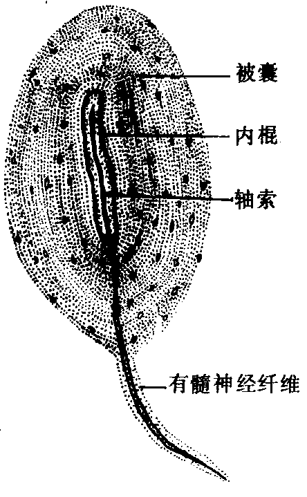 释义 | 神经组织nervous tissue具有感受刺激和传导兴奋的神经细胞和神经胶质细胞构成的组织。神经细胞又称神经元,是神经组织的结构和功能单位。相邻两神经元之间有特殊的连接结构称突触,能将一个神经元的冲动传递给另一个神经元。神经胶质细胞位于神经元之间,对神经元起支持、保护和营养等作用。它们以特有的构筑形式构成神经系统。神经细胞和大部分神经胶质细胞来源于胚胎期的神经管和神经嵴。神经管最初为假复层柱状上皮称神经上皮,不断分裂分化神经细胞和胶质细胞,前者发育为中枢神经系的神经元,后者发育为神经元之间的神经胶质细胞。神经嵴细胞一部分分化为脑脊神经节细胞和植物性神经节细胞,另一部分则分化为神经膜细胞和卫星细胞,即周围神经系中的神经胶质细胞。 图 1 神经元的构造和类型 (a) 多极神经元; (b) 双极神经元; (c) 假单极神经元1. 树突; 2. 尼氏体; 3. 细胞核; 4. 侧枝; 5. 轴突;6. 髓鞘; 7. 神经膜; 8. 神经膜细胞; 9. 郎飞氏节;10. 感受器 突触 由两神经元接触处构成。依兴奋传递的性质可分为两种,一为电突触即缝管连接,只是少数,另一种是化学性突触,占突触大部分。按前,后位神经元接触的部位又有轴-树、轴-体、轴-轴、树-树、体-体等突触之分,常见者为前两种。以其亚微结构以轴-体突触为例,包括三个部分(图2)。❶突触前膨大及突触前膜(属前位神经元的轴突终末膨大及其细胞膜),膨大处含有神经递质小泡称突触小泡,大小不等(20~65nm),圆球形或米粒状,还有线粒体和微丝等; ❷突触后膜(属后位神经元的胞膜),其上有与递质相应的受体; ❸突触间隙,为前、后膜之间的间隙,宽约20~30nm。当神经冲动传至突触前膜时,电位控制的Ca2+通道开放,Ca2+进入突触,在线粒体提供的ATP和微丝参与下,突触小泡靠近突触前膜,以胞吐方式释放出递质至突触间隙中,递质与突触后膜上的受体结合,引起细胞膜去极化,而出现神经冲动的传递。 图 2 轴-体突触结构 (a) 突触低倍镜观; (b) 突触高倍镜观; (c) 突触亚微结构;(d) 突触小泡释放递质至突触间隙 神经纤维 主要由轴突和外包的神经胶质细胞(神经膜细胞或少突神经胶质细胞)构成。按髓鞘的有无分为有髓神经纤维和无髓神经纤维两种。 有髓神经纤维 轴突外包一层髓鞘和神经膜,髓鞘是神经膜细胞(即神经胶质细胞)的胞膜反复缠绕轴突而形成的多层膜结构,神经膜则是该细胞的含核和胞质部分,它们都有节段性。段间的间隙称神经纤维节(又称郎飞氏节),相邻节之间的一段神经纤维称节间段。在髓梢处神经兴奋不能传导,髓神经的传导是沿着神经纤维节呈跳跃式的传导,节间段愈长跳跃距离愈远,神经冲动的传导也愈快; 体内除嗅神经、视神经和植物性神经的节后纤维外,绝大部分外周神经纤维属此类型。中枢神经系的有髓神经纤维,其髓鞘由少突神经胶质细胞的突起包绕轴突形成,其神经纤维节较宽。 无髓神经纤维 轴突外无髓鞘包裹,只有一层神经膜细胞连续包在其外,故无神经纤维节。纤维较细,表面光滑,植物性神经的节后纤维属此类型。 神经末梢 外周神经纤维的终末部分,它终止于全身各器官和组织内,依功能分为感觉神经末梢和运动神经末梢两类。 感觉神经末梢 为感觉神经元外周支的终末部分。它和相连系的器官组织的接触点共同构成感受器。可感受体内、外各种刺激并传至中枢。依存在部位可分为外感受器和内感受器两种。前者感受冷、热和痛等外环境刺激,后者感受来自内脏的刺激。还有,本体感受器,感受骨骼肌和肌腱张力的改变以及关节运动的位置等。依感觉神经末梢形态结构,又可分为游离和有被囊的感觉神经末梢两种。前者是外周支反复分支并失去髓鞘,以裸露的分枝末梢分布于上皮组织和肌组织,司痛觉和冷热觉等; 后者是神经终末部周围包有结缔组织被囊,如环层小体(图3)。它是圆形或椭圆形结构,中央有一条棒状的内棍,其内有轴索,内棍外包有厚的被囊,由数十层胶原纤维膜及膜间的成纤维细胞构成。它主要分布于皮肤深层、被膜和内脏器官,司压觉。此外,还有分布于真皮乳头司触觉的触觉小体和分布于骨骼肌感受肌纤维舒缩的肌梭等。