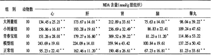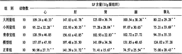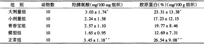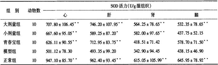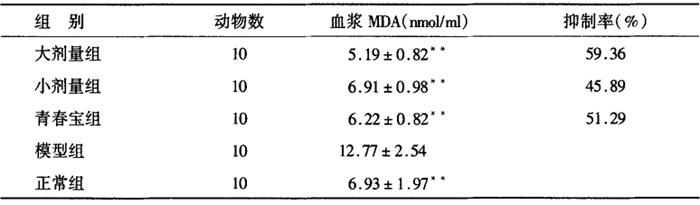 释义 | 何首乌 牛膝 【中医理论】 何首乌(米泔浸与枣共煮烂,去枣,焙干)一斤,牛膝(酒浸,焙干)半斤,研末炼密为丸,能补暖脏腑,祛逐风冷,利腰膝,强筋骨,黑髭发,驻容颜,久服轻身延年,因二味补益肝肾之功甚灵,故名二灵丹,《御药院方》卷六有载。何首乌甘苦微温,不寒不燥,功能补肝肾,益精血,祛风冷,乌须发;牛膝甘苦酸平,走而能补,性善下行,功能补肝肾,利腰膝,强筋骨,行气血。二药相须为伍,补而不滞,温而不燥,久服自有培元固本,益寿延年之效。 《古今医统》卷六十六以何首乌,川牛膝各一斤,用黑豆蒸为方,名曰二仙丹,能补肝肾,益精血,黑髭发,且何首乌长于益精血有祛风止痒之效。牛膝长于除痹痛,有强腰活血之力,相须为用,补而不滞,因此是治虚损腰疼,血虚身痒,头晕肢麻等证颇有效验。故《仙拈集》卷一称此为二神丸;《圣济总录》卷八谓“何首乌丸”。 【药理研究】 抗衰老作用[]] 常春胶囊由何首乌、牛膝组成。 衰老模型制作:取小鼠50只,雌雄各半,随机分为5组。第1~4组每日颈背皮下注射5%D-半乳糖0.5m1,第5组注射同等体积生理盐水,作为空白对照,连续注射10d,于第11d除继续注射D-半乳糖,第1、2组小鼠按体重25g/kg,12.5g/kg分别灌服常春胶囊水煎剂,为大、小剂量组;第3组小鼠灌服等体积的青春宝口服液;第4组模型小鼠和第5组(正常组)小鼠均灌服等体积生理盐水,再连续给药和造模30d。于最后一天灌胃和注射D-半乳糖2h后,称体重,眼眶取血,抗凝,同时立即取出小鼠心、肝、肾、脑及睾丸等脏器组织,分别称重,制作匀浆,用于生化测定;剪下鼠尾剥离尾腱,备用。 测定方法:血浆、脏器组织中LPO测定采用TBA法;血液和脏器组织中SOD活性测定采用邻苯三酚法;血液中CAT活性测定,按魏盛装法;全脑MAO-B活性测定,按戴尧仁法;血液CSH-Px活性测定,按夏奕明法;蛋白质含量测定按Lowry法;脏器组织中LF和尾腱羟脯氨酸含量测定,分别按Sohal法和李仪奎法进行。 对衰老小鼠血浆脂质过氧化(LPO)的影响:见表12-51-1。 表12-51-1 常春胶囊对衰老小鼠血浆脂质过氧化的影响(x±s) 与模型组比较:*P<0.05,* *P<0.01 由表12-51-1可知,衰老小鼠口服常春胶囊30d后,血浆中脂质过的氧化物丙二醛(MDA)较模型组显著降低(P<0.01),且作用强度呈量效关系,其抑制率大、小剂量组分别为59.36%和45.89%,显示出常春胶囊对1PO的形成有明显的抑制作用。 对衰老小鼠脏器组织匀浆脂质过氧化的影响:见表12-51-2。 表12-51-2 常春胶囊对衰老小鼠组织匀浆脂质过氧的影响(x±s) 与模型组比较:*P<0.05,* *P<0.01 结果表明,正常小鼠心、肝、肾、脑及睾丸组织中MDA含量均明显低于模型组水平(P<0.01),大剂量组可显著抑制小鼠心、肝、肾、脑中MDA的形成,与模型组比较,呈高度显著性(P<0.01),其抑制率分别为:44.86%(心)、22.49%(肝)、46.56%(肾)、25.0%(脑),对睾丸中MDA的形成也有明显抑制作用(28.56%,P<0.05);小剂量组能显著降低小鼠心肌、肝、肾中MDA含量,其抑制率分别为35.63%、13.75%、34.24%(P<0.01),而对脑、睾丸组织中MDA的形成无明显影响(P>0.05)。 对衰老小鼠红细胞中超氧化物歧化酶(SOD)活力的影响:见表12-51-3。 表12-51-3 常春胶囊对衰老小鼠红细胞中SOD的影响( 与模型组比较:* *P<0.01 上表显示,常春胶囊大、小剂量组与模型组比较,SOD活力均有极显著的提高(均为P<0.01),且作用随剂量递升而增强。大剂量组与青春宝组比较,效果明显优于后者(P<0.05)。 对衰老小鼠脏器组织中超氧化物歧化酶(SOD)活力的影响:见表12-51-4。 表12-51-4 常春胶囊对衰老小鼠脏器组织中SOD活力的影响(x±s) 与模型组比较:*P<0.05,* *P<0.01 由上表可以看出,常春胶囊大剂量组可明显升高小鼠心肌、肝、肾、脑组织中SOD活力,与模型组比较,差异极显著(P均<0.01),其上升率分别为29.20%、33.89%、39.23%、17.73%;小剂量组也可增强肝、肾、心中SOD活力(P<0.05、P<0.01、P<0.01),其上升率分别为16.27%、24.92%、41.08%,但对脑中SOD活力没有明显的影响(P>0.05)。 对衰老小鼠血液过氧化氢酶(CAT)活力的影响:见表12-51-5。 表12-51-5 常春胶囊对衰老小鼠血液CAT活力的影响(x±s) 与模型组比较:* *P<0.01 结果表明,常春胶囊和青春宝均能明显地提高小鼠血液中CAT的活力,与模型组比较,差异十分显著(P均<0.01),并已接近或达到正常水平,尤以小剂量作用最强,且与青春宝比较,也有一定的差异(P<0.05)。 对衰老小鼠脑组织单胺氧化酶(MAO-B)活性的影响:见表12-51-6。 表12-51-6 常春胶囊对衰老小鼠脑中MAO-B活性影响(x±s) 与模型组比较:* *P<0.01 表中显示,衰老模型小鼠脑中MAO-B活性明显高于正常对照组(P<0.01),而常春胶囊大、小剂量组和青春宝组均可显著抑制衰老小鼠脑中MAO-B活性,其抑制率分别为23.94%、35.41%及19.70%(P均<0.01),且小剂量组与青春宝比较,也有一定的差异(P<0.05)。 对衰老小鼠血液谷胱甘肽过氧化物酶(GSH-Px)活力的影响:见表12-51-7。 表12-51-7 常春胶囊对衰老小鼠血液GSH-Px活力的影响(x±s) 与模型组比较:*P<0.05,* *P<0.01 结果显示,常春胶囊和青春宝均可显著地提高衰老小鼠血中GSH-Px活性,与模型组比较,差异极显著(P均<0.01),且作用强度超过正常水平。此外,小剂量组与青春宝组比较,也有一定的差异(P<0.05)。 对衰老小鼠脏器组织脂褐素(LF)含量的影响:见表12-51-8。 表12-51-8 常春胶囊对衰老小鼠脏器组织中脂褐素含量的影响(x±s) 与模型组比较:*P<0.05,* *P<0.01 结果表明,衰老小鼠心、肝、肾、脑及睾丸组织脂褐素均较正常小鼠显著增加(P均<0.01