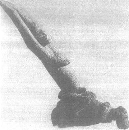 这件木雕人像是马里多贡族的作品。多贡族居住在尼日尔河河套的高原之上,那里自然环境处于与世相对隔绝的状态,往往要攀着绳索才能到达他们的部落。在这种半封闭的社会圈子里,他们更多地保留了传统的生活习俗、宗教礼仪。他们崇拜精灵与生命,认为人死后不过是转换生命的形式,常常以偶像(木雕、雕塑)等代替死者的精灵,以示生命的永恒不灭。非洲人在创造这些木雕偶像时,是很神圣的,常常躲在隐蔽的地方,充满激情地以刀斧砍凿雕刻。据研究,他们创作这种偶像不在乎像与不像,可能出于某种感情的需要常以象征、变形、夸张等手法处置。所以使人感到这些木雕有强烈的节奏、韵律,产生心灵上的愉悦。这件人物祭祀木雕带有两性特征,为坐姿,上身下身呈钝角,双手高举过顶。那极度夸大的动势和完整利落的造型不能不叫人钦佩非洲艺术家的想像力和概括力。