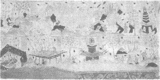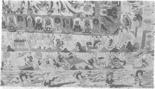 释义 | 福田经变图壁画 福田经变图壁画北周。甘肃省敦煌县莫高窟第296窟窟顶壁画。《福田经》讲:种丝发之德,可获无量之福。中国的北朝末期,僧尼的生活日趋腐化,佛教濒临绝境,禅僧信行要求僧尼行苦行,广行布施,为自己积功德,莫高窟也随之出现了《福田经变》的绘画题材。此图绘于窟顶,分上下两层,有造佛塔,盖佛堂;种植果园荫庇旅人;救治病人;修桥铺路;凿井饮畜;过渡羸弱等场面。这些画面虽然表现的是宗教题材,实则是现实生活的写照,使人颇感亲切。 ☚ 卢舍那佛像壁画 福田经变(局部)壁画 ☛ 福田经变图壁画 福田经变图壁画隋。纵32厘米,横345厘米。甘肃省敦煌县莫高窟第302窟窟顶人字披西侧壁画。此画据《福田经变》所绘,为莫高窟仅有的两幅之一。画描述了僧人如何广行布施,为自己积功德。画面上有打井饮畜,修造渡桥作坚牢船渡济人民,建造寺庙、佛塔,救治病人,种植果园等场景。图中僧人多赤裸上身,只穿短裤,有的在果园劳作,有的在塔上砌砖、抹灰,有的伐木,有的扛木,一派热烈而忙碌的场景,反映了当时社会生活的各种场景。每个画面多以树木相隔,树木种属已可分辨,这既是自然过渡,又增添了清幽的景色。整个画面的色泽较为淡雅悦目,较多地保留了北朝遗风,可称为隋代初期莫高窟壁画的代表作。 ☚ 说法龛楣壁画 睒子本生图壁画 ☛ |