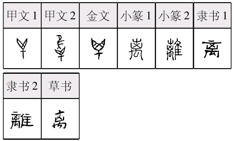 ❹ 斑驳陆离|半步不离|不即不离|仓皇流离|惝恍迷离|寸步不离|颠沛流离|故土难离|光彩陆离|光怪陆离|麦秀黍离|貌合神离|破碎支离|扑朔迷离|若即若离|神光陆离|生别死离|形影不离|影形不离|鱼溃鸟离|众叛亲离|众散亲离 离lí (甲) (篆) 甲骨文为象形字,像捕鸟的网。小篆变为左右结构,加了一只手。引申为“遭遇”,与“罹”通。王逸说:“离骚者,犹罹忧也。”繁体“離”,实际上是以“离”为声符的形声字。又通“蓠”(一种香草),“扈江离与辟芷兮,纫秋兰以为佩。”(屈原《离骚》)另读chī,《集韵》作“抽知切”。生成的形声字有: lí 漓(淋漓尽致) 璃(玻璃) 篱(篱笆) 醨(薄酒) 蓠(江蓠) chī 魑(魑魅魍魉) 螭(“螭殿黄昏未锁”——程珌《水调歌头》) 摛(铺陈)