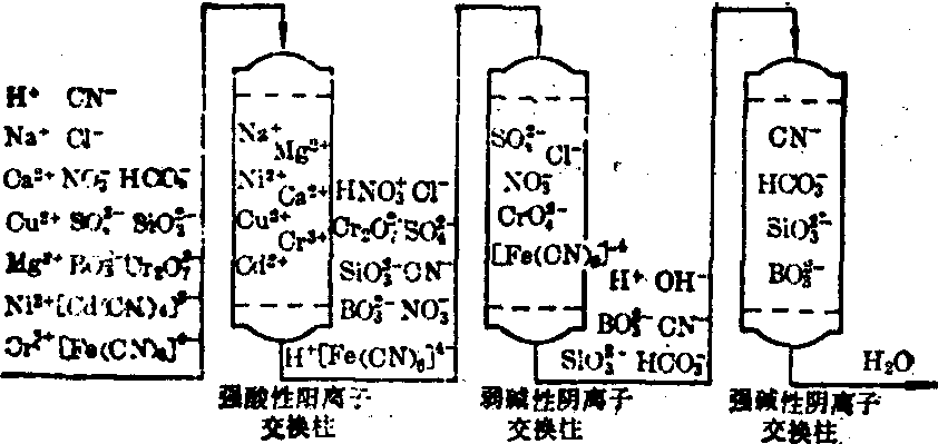 释义 | 离子交换法ion exchange technique系分离或提纯某种物质的一种方法。此方法是应用离子交换剂交换水溶液中的阴、阳离子,使其吸附在交换剂上而除去溶液中的游离离子,或使游离离子与非极性游离离子基因分离。此法主要用于提取、分离、纯化某些物质,可用于中草药加工生产及化学制药等。 离子交换法 离子交换法废水通过多孔性颗粒状离子交换剂,使废水中的某些离子化物质与交换剂中的活性离子发生等当量的置换反应,置换废水中所含的某些离子,而把交换剂中的活性离子释放到水中,这种水处理方法,称为离子交换法。 由于一般凝胶型树脂的孔隙过于微细(2~4nm即20~40),易被大分子有机物所堵塞, 故有时采用大孔型树脂。但大孔型树脂孔隙大小不匀,仍有部分微孔。可把二乙烯苯交联物质改为聚苯乙烯,实行氯甲基化交联,形成基本上均等的孔隙,称为均孔型交换树脂,可以防止有机物污染,但其再生能力和交换容量尚不理想。 各种离子交换树脂的交换机能各有特点,下图表示各种离子交换柱树脂的交换机能。 各种离子交换柱的交换机能 离子交换法的工艺过程,主要为吸附交换及树脂再生。当使用新的离子交换树脂时,应先通过酸、碱处理,让树脂颗粒发生膨胀、收缩,使一些低聚物类的杂质被洗脱。 离子交换树脂适用于低分子离子,对非电解质和高分子电解质不太适用。在处理废水时,由于水的浑浊度高,硅酸盐类和油类等杂质易吸附于树脂上,堵塞树脂孔道,使扩散速度降低,容易漏穿,造成树脂再生困难,而降低树脂的交换容量。故在废水进入离子交换柱前,要经过预处理,除去部分杂质,减低浑浊度和硬度,以避免离子交换树脂的非可逆吸附及树脂内的沉淀析出。 废水温度高,能加速离子交换的扩散反应;但温度过高,将引起树脂的分解。一般阳离子交换树脂允许的水温不超过100℃,阴离子交换树脂允许的水温不超过60℃。 在离子交换过程中,有交换能力的活性离子置换了废水中需交换的离子使活性减少,大部分树脂经交换后饱和而失效。当排出水中需交换离子的浓度达到某定值时,称为“漏穿”。此时应采用适当的再生剂处理饱和或接近饱和的离子交换剂,恢复其交换能力,这一过程称为再生。 再生过程为: ❶逆洗: 水洗10~15min,流速为10~20m/h。 ❷再生: 采用适当浓度的再生剂处理交换剂,恢复其交换能力,但完全再生需要大量再生剂,在工业上为了节约费用,仅使交换剂再生达到某种程度。 ❸再逆洗: 去除树脂内残留的再生液。 ❹水洗: 以大流速冲洗树脂,完全除去再生液。 离子交换柱(塔)是装有离子交换剂的圆筒状结构。根据处理的废水量和浓度,确定装入离子交换柱的树脂量。树脂层厚度一般超过60cm,因小于60cm时,流速对树脂工作交换容量有显著的影响。由于离子交换树脂的膨润作用,交换柱的高度应留有充分的余量。 交换剂再生处理的操作条件:对阳离子交换树脂来说;处理流速为20~30m/h,逆洗流速为30~40m/h,再生流速在10m/h以下。再生剂一般可用5~10%H2SO4,每升树脂需用120~150gH2SO4。对阴离子交换树脂来说:处理流速为30~40m/h,逆洗流速为30~40m/h,再生流速在10m/h以下。再生剂可用3~7%NaOH,每升树脂需用52~60gNaOH。保证树脂在交换过程中的离子交换和再生效果,通常在离子交换法中,采用处理流速为2.5m/h,再生流速为0.5m/h。 离子交换法可分为分别装有阴、阳离子交换剂的交换柱串联应用的复床式;在同一交换柱中装有混合的阴、阳离子交换剂的混床式以及在操作过程中,交换剂从交换柱内循环流出,在柱外再生的连续操作的移动床式等。 弱酸、弱碱性交换树脂的交换容量比强酸、强碱树脂高一倍左右,再生容易,费用较低,应用较广。离子交换法工艺复杂,操作技术要求高,运转及设备费用也较高,因此要求严格的管理,以提高处理效率并降低费用。 ☚ 废水电解 电渗析法 ☛ 离子交换法ion exchange technique 离子交换法ion-exchange technique 离子交换法ion exchange method |