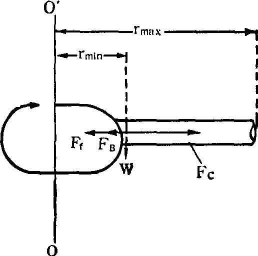 (1) 力的种类: 悬浮在介质中的颗粒在离心机转头中,于水平面内作高速旋转运动,它受到四个力的作用,即离心力场给它的离心力 (Fc)、介质给它的浮力 (FB)和摩擦力(Ff)以及重力场给它的重力 (W)。如图所示。在这四个力中,使颗粒产生运动(沉降)的始动力主要是离心力Fc。虽然重力也是颗粒产生运动的一个始动力,但它比离心力小得多,完全可以忽略不计。即使是在低速离心时,如1000转/分(即r.p.m)时,距离旋转轴心10cm处的颗粒所受到的离心力就为重力的112倍 (详后)。所以,可以认为,溶质颗粒在离心力场中只受到三个力的作用,就是离心力、浮力、摩擦力。
