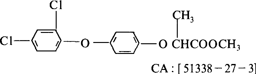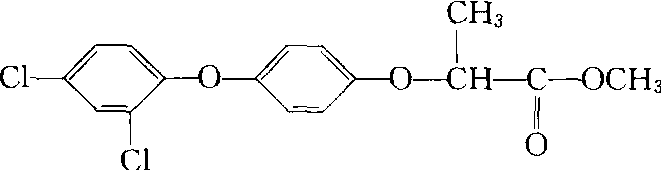 禾草灵diclofop-methyl选择性叶面喷雾禾本科除草剂,又名伊洛克桑(Illoxan)、禾草除、苯氧醚。化学结构式:  德国赫司特化学公司1974年首先合成开发。 性能 纯品为无色、无臭结晶固体,熔点39~41℃,20℃时的蒸气压为3×10-7×133.322帕。22℃时水中溶解度为3毫克/升,易溶于丙酮、乙醚和二甲苯,密度为1.3克/厘米3(40℃)。对人畜毒性较低。雌鼠口服急性LD50 563毫克/千克,本品可被植物根、茎、叶吸收,只能局部内吸,体内传导性差。其主要作用部位在分生组织,药剂在生长点越多,防治效果越高。主要杀草原理在于抑制生长和对细胞膜的破坏。在植物体内部,禾草灵因脱甲基变酯为酸,它能使敏感植物细胞膜破坏及细胞解体,而其酯态是一种强植物激素颉颃剂,抑制茎生长,酯向上移动造成叶组织失绿和坏死。施用禾草灵后,野燕麦在5~10天出现组织萎缩,叶绿素减少,幼芽内ATP降低,分蘖节渐变为褐色、腐烂。选择性是由于不同植物体内降解及解毒的机制和速度不同。在抗药性植物体内禾草灵呈芳基羟基化反应,轭合为芳基葡萄糖苷,使之解毒。狗尾草对禾草灵很敏感,因它对本剂有高的渗透率且分解很慢。禾草灵可作土壤处理,但用量较大,土中残效期90~180天。 应用 可用于小麦、大麦、黑麦、甜菜、菜豆、大豆、苜蓿、荞麦、亚麻、油菜、马铃薯、西瓜等作物地防治野燕麦、稗草、看麦娘、狗尾草、马唐、毒麦等一年生禾本科杂草,用量为0.7~1千克/公顷。对早熟禾、大多数雀麦变种和阔叶杂草无效。双子叶杂草有抗药性。双子叶植物除棉花外,一般均安全。燕麦、高粱、谷子、玉米、甘蔗和水稻对本剂敏感。野燕麦2~4叶期、稗草、黑麦、毒麦等2~6叶期为施药适期。草龄大,药量增大。作物生长期内都可施用。用量0.5~1千克/公顷。气温冷凉、野燕麦生长旺盛时药效优于高温、野燕麦生长不旺时。土壤湿度30%时为宜。不宜与2,4-滴类及苯达松或氮肥直接混用。可与甜菜宁、嗪草酮混用。禾草灵diclofopmethyl苯氧基类选择性茎、叶处理除草剂。化学名称为2-〔4- (2′,4′-二氯苯氧基)苯氧基〕丙酸甲酯。化学结构式如下。原药为无色、无臭固体,熔点39~41℃,沸点175~176℃/13.33 Pa,20℃时蒸气压为34.397×10-6 Pa。几乎不溶于水,稍溶于乙醇,易溶于丙酮、乙醚、二甲苯等有机溶剂。具有内吸和触杀作用,可通过叶及根吸收,破坏叶绿素、抑制生长,阻止养分和水分的输导而使杂草死亡。适于小麦、大麦、黑麦、大豆、甜菜、马铃薯、花生、向日葵、油菜、亚麻等作物田防除野燕麦、毒麦、狗尾草、看麦娘、马唐、千金子及宿根高粱等禾本科杂草。大鼠急性口服LD50为563 mg/kg,急性经皮LD50>5 000 mg/kg。