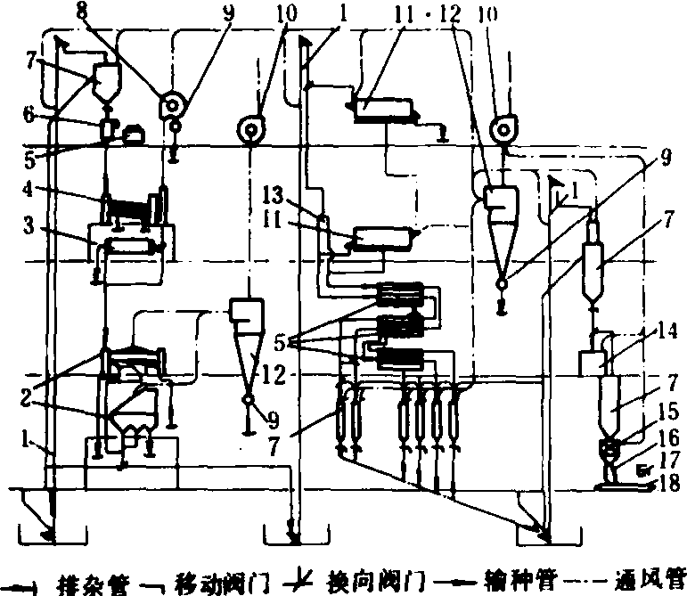 分段提升式种子加工厂流程图 1.斗式提升机; 2.重力式精选机; 3.窝眼筒;4.筛式或风筛式清选机; 5.空气压缩机; 6.流量自动控制器;7.种子贮存箱; 8.吸风室; 9.闭风器;10.吸风机;11.圆筒筛; 12.旋风除尘器; 13.分流器;14.拌药机;15.自动秤; 16.麻袋; 17.缝袋机; 18.带式输送机 种子加工按加工种子对象的不同分为通用厂与专用厂。通用种子加工厂配备的机具较完全,输送管路采用多种流程,可依据加工对象选用其中的机具和管路。专用种子加工厂按所加工的种子命名,如玉米种子加工厂、蔬菜种子加工厂、牧草种子加工厂、棉花种子加工厂等。除了作物单一、种子培育集中、种子加工工艺固定的地区外,一般多为通用厂。因为加工不同作物种子的主要机型差别不大,只要多配备几台特殊用途的机器就可扩大种子加工范围。不同加工对象的差别主要也反映在前处理过程。批量较大的种子用箱式烘干机,批量小的可成袋烘干。在玉米种子加工厂中,来料是果穗时,就用烘干室烘干,并需配备玉米剥皮机和脱粒机等。有些作物种子在加工前还需增加一些工序,如对水稻、大麦、燕麦、蔬菜和牧草中的某些品种要脱芒去毛,对棉籽要脱绒等。在前处理中是否需要初清选视来料含杂情况而定。初清选作业多采用生产率较大的风选机和孔眼较大的粗筛,并安排在烘干之前进行,以改善种子在烘干机中的流动性和减少热能消耗。不同作物种子的其他工艺过程和所用机具基本相同,安排顺序为:清选(平筛或旋转筛)、分级、窝眼清选、重力清选、拌药、称量装包、缝袋等。现代化种子加工厂有集中的操作控制室,任何环节发生故障时都能自动报警和灯光显示,并自动停机。工厂化加工种子不仅质量好,而且生产率高。 |