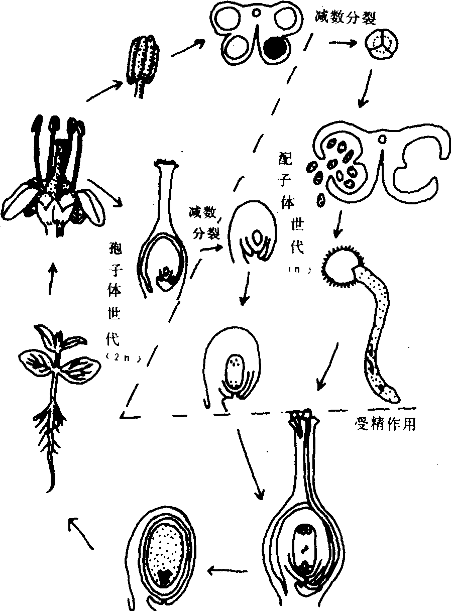 释义 | 种子植物的世代交替 种子植物的世代交替zhongzizhiwu de shidaijiaoti种子植物的世代交替特点是孢子体世代占绝对优势,配子体世代非常简化,并寄生在孢子体上。以被子植物为例说明:孢子体是由根、茎、叶、花、果实和种子构成的植物体,配子体是由很少细胞组成的花粉粒(2或3个细胞)和胚囊(通常为7个细胞8个核)。花粉粒是由花的雄蕊的花药中产生的,花药中的每个花粉母细胞经减数分裂形成4个未成熟的花粉粒叫小孢子,小孢子进一步分裂1~2次,形成2或3个细胞的成熟花粉粒(雄配子体)。胚囊是由花的雌蕊子房中的胚珠产生,1个胚珠只产生1个胚囊,未成熟的胚囊叫大孢子,大孢子经3次有丝分裂最后形成7细胞8核的成熟胚囊(雌配子体)。由上述可知,被子植物的孢子体世代包括:种子萌发长成植株,到开花时雌蕊中的胚囊母细胞的形成和雄蕊中花粉母细胞形成为止的这一阶段,配子体世代是从胚囊母细胞和花粉母细胞减数分裂后,形成大孢子(未成熟胚囊)和小孢子(未成熟花粉粒)开始直到成熟胚囊和成熟花粉粒形成为止的整个阶段。可见,被子植物的世代交替是孢子体世代占绝对优势,配子体世代非常简化,并寄生于孢子体上。 图567 被子植物世代交替 ☚ 苔藓植物的世代交替 囊胚 ☛ |