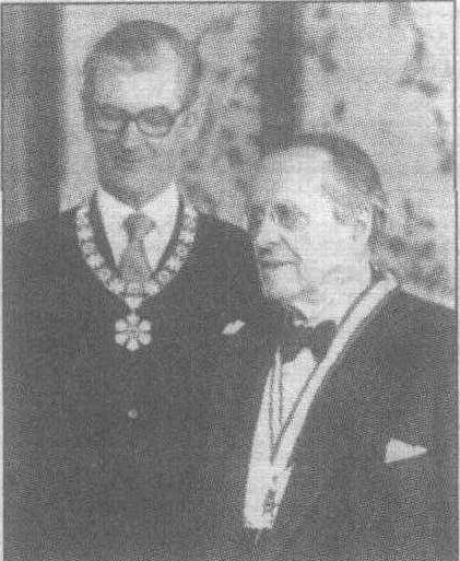 释义 | 科尔米耶,E.1885~1980Cormier,Ernest建筑设计师,工程师。生于蒙特利尔。1908年~1914年在巴黎美术学校学习。毕业当年获罗马设计大奖。数次巡游法国,深受欧洲建筑艺术的影响。主持设计的蒙特利尔法院(1920)和蒙特利尔大学(1950)是其杰作。曾获加拿大总督勋章。被誉为20世纪魁北克建筑史上的划时代人物。 E.科尔米耶(右)荣获加拿大勋章 。 |