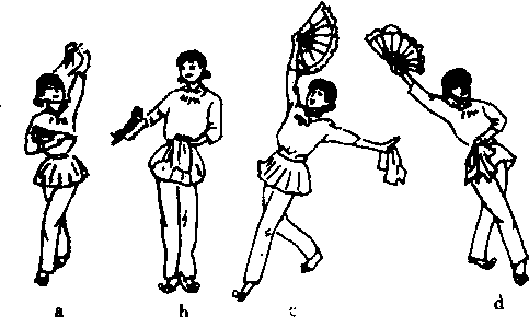 ❿吸跳步: 正步准备。第一拍右脚上步,身体向右崴,双臂由体侧向前晃手。第二拍,正吸右腿,同时右脚原地跳一步,脚掌原地,双手于胸前击掌。左右脚交替起步动作相同 (图c)。⑾平扭步:陕北秧歌基本舞步。正步准备。动作时,左右脚随音乐节拍交替平走直线。双肩打开,大臂有架劲,作双摆手动作。⑿三步一停(亦称前进步):陕北秧歌基本舞步。正步准备。动作时向前平扭三步(左或右脚起步),第四步后退一步,身体重心移至后脚,前脚离地,屈膝后收小腿于后腿小腿前,同时双臂体侧划横∞字,或做双摆手。⒀十字步:陕北秧歌基本舞步。基本做法同一般十字步,但要求步幅大,身体重心前后大幅度移动,身体加大角度的扭动。动作时双臂动作可多变化。⒁后踢跳步:做法基本同幼儿后踢步,但要求小腿后踢同时大腿也要后踢,主力腿应尽量向上跳起,在空中有腾空感。⒂秧歌大跳步:陕北秧歌基本舞步。正步准备。以左脚为例,向前平扭三步,同时双摆手,第四步斜探海跳 (亦称回头望目跳)。