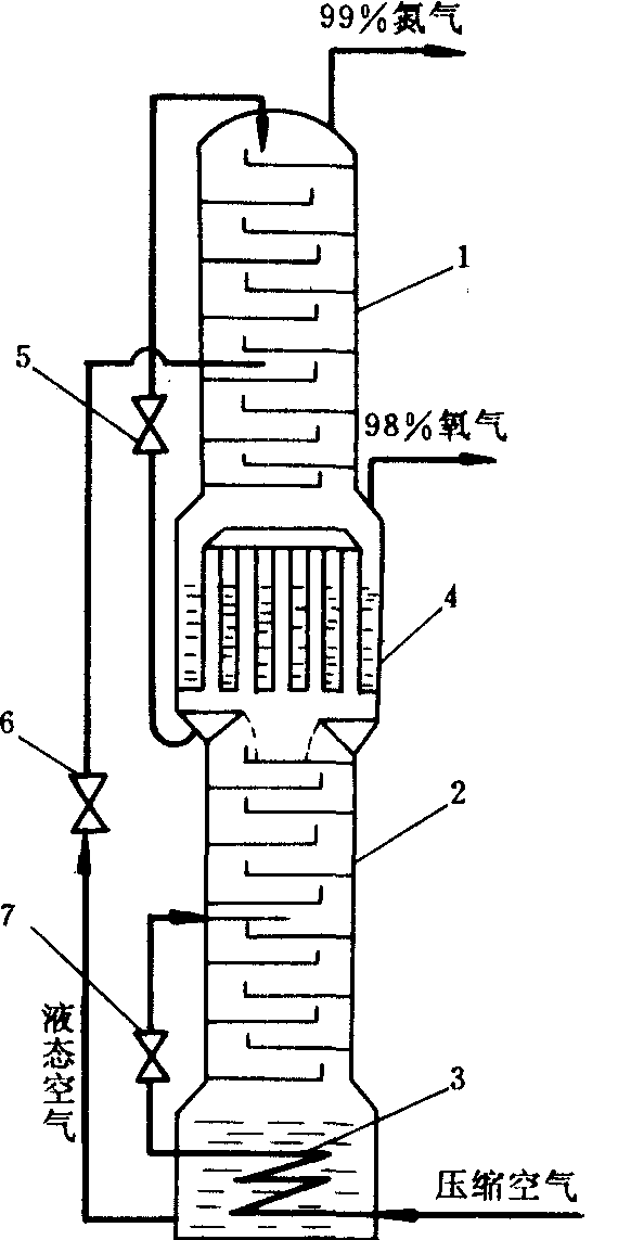 图2为分离空气的双塔式精馏塔。它由上塔和下塔两个塔组成,中间是一个冷凝蒸发器,冷凝蒸发器既是下塔的冷凝器,又是上塔的 蒸发器。操作时,预冷的压缩空气由下塔的塔底进入,通过热交换器降低温度,再经节流阀进入下塔的中部。其中蒸发出来的气体由塔板上升,液体回流下降。气体上升到冷凝蒸发器处所形成的冷凝液一部分作为回流液下降,另一部分导入上塔塔顶作为上塔的回流液。下塔塔底的液态空气导入上塔中部作为上塔进料。由于氮气的沸点比氧气低,因此,随着塔内气-液两相之间质量传递和热量传递的进行,上升气体中氮气的含量越来越高,下降液体中氧气的含量越来越高。最后,由塔顶可得到含量为99%的氮气,由冷凝蒸发器的列管间可导出含量为98%的氧气。空气中的其他组分,因其沸点不同各自在不同的部位浓集,只要在相应的部位抽取馏分,而后加以浓缩和精制,就可得到各种稀有气体。例如,可从上塔中部抽取一部分气体用以提氩;从冷凝蒸发器顶部可收集氦和氖; 氪和氙是空气中沸点最高的组分,最后集中在液氧和气氧中,需进一步从氧气中提取。 ☚ 硬水软化 火法冶炼 ☛ |