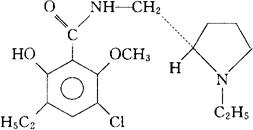 C17H25ClN2O3=340.85 CAS-84226-12-0 (-)-(S)-5-氯-3-乙基-N-[(1-乙基-2-吡咯烷基)甲基]-6-甲氧水杨酰胺。 (-)-(S)-5-Chloro-3-ethyl-N-[(1-ethyl-2-pyrrolidinyl)methyl]-6-methoxysalicylamide. 3-氯-5-乙基-N-[(1-乙基-2-吡咯烷基)甲基]-6-羟基-2-甲氧基苯酰胺。 3-Chloro-5-ethyl-N-[(1-ethyl-2-pyrrolidinylmeth-)yl]-6-hydroxy-2-methoxylbenzamide. 抗精神病药,多巴胺受体拮抗药。 Eticlopide,A38503,FLB131. INN,USAN.  |