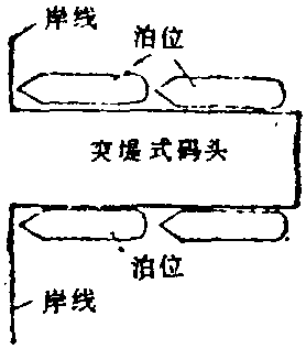 释义 | 突堤式码头 突堤式码头码头纵向与岸线处的等高线成直角或斜角(一般不小于45°)布置的码头,即码头突出天然岸线伸向水域。这种码头靠自身结构筑成大片陆域与港区后方作业地带相联,它的两侧一般都可靠船。它与顺岸式码头相比,突出的特点是: 占用岸线少、泊位和疏运通道布置紧凑、掩护和管理条件较佳。但易产生港池淤积、船舶操作受限制。它多用于岸线不足且陆域有限的情况下。由于易产生淤积,故河港一般不予采用。如图示。