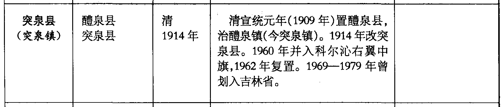 突泉县(突泉镇)醴泉县突泉县清1914年清宣统元年(1909年)置醴泉县,治醴泉镇(今突泉镇)。1914年改突泉县。1960年并入科尔沁右翼中旗,1962年复置。1969—1979年曾划入吉林省。