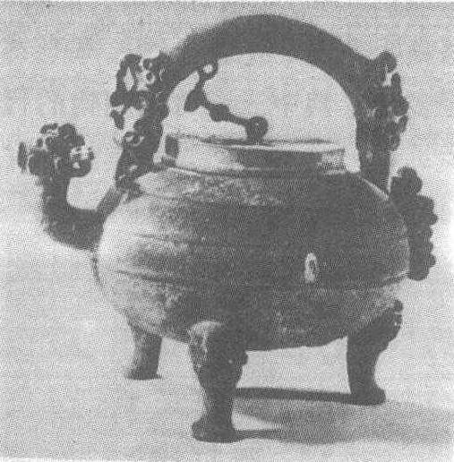 释义 | 窃曲纹夔龙提梁盉 窃曲纹夔龙提梁盉春秋。盛酒和水酒调和器。通高26厘米,口径11.1厘米。1978年河南省浙川县下寺1号楚墓出土。河南省博物馆藏。此盉圆形,带盖,流作兽首状,兽口圆张。提梁的两端呈夔龙首状,盖上有环钮系一链环与提梁相连。饕餮三蹄形足。腹部有一对环钮,梁后附一蟠螭形鋬。盉盖与腹部饰窃曲纹。这种提梁盉,河南省南部及湖北省江陵等地楚墓中常有出土。 ☚ 镂空蟠螭纹铜禁 龙耳铜方壶 ☛ |