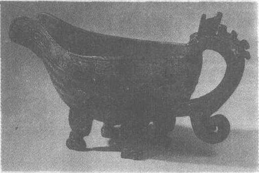 春秋。通高17.3厘米,口长27.8厘米,宽16.2厘米。辽宁省博物馆藏。此匜腹部呈椭圆形,流为槽形而侈,四板形足饰云纹,手鋬作龙探首饮水状。口沿饰一周窃曲纹,腹部为瓦纹,造型构思奇巧。“匜”,是盥洗器,与盤配合使用,其形如瓢,前有流,后有鋬,使用时,用匜泻水于手洗脸洗手,用盤接水。