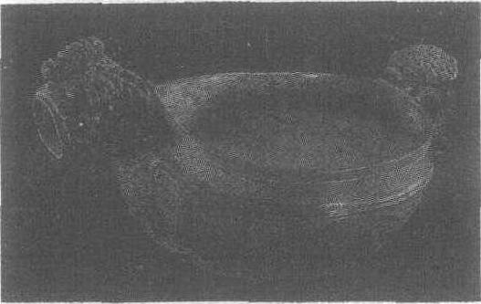 春秋。盥洗器。通高14.3厘米,长27.5厘米。1978年河南省淅川县下寺1号楚墓出土。河南省博物馆藏。此匜呈椭圆形。前有兽头,张口作流,后有一兽,弓身作鋬。平底。口沿之下与腹部饰窃曲纹,间饰菱形纹。这种器形,与中原地区多作凹槽口沿、四蹄足的作风有异。