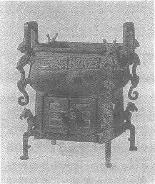 西周。古代炊器。通高17.7厘米,口横11.9厘米,口纵9.2厘米,腹深6.3厘米。重1.6公斤。1976年陕西省扶风庄白村出土。陕西周原扶风文管所藏。此鬲呈长方形体,分上下两部分,上为器身,下为底座,器身四角略圆,下腹微鼓。双腹耳,四隅各铸一龙。口沿下饰云纹衬地的窃曲纹。下部器座为灶,正面开门,有可启闭的双扇门。右边的一扇门上,铸一浮雕人,无足。在刖刑奴隶的腹部插一铜棍作为门闩。在另一扇门的对应处铸一兽头状的粗环钮,门闩可插入。灶两侧各有四个长方形孔窗,背面饰镂空窃曲纹。灶的四角下部铸怪兽为足。灶内可燃木炭以温鼎内食物。此器造型优美,设计颇俱匠心,是西周中期不可多得的艺术佳作。北京故宫博物馆收藏一鬲,与此器相似。