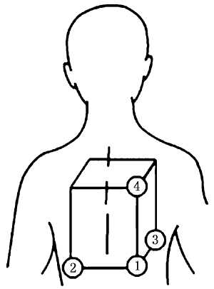 该导联体系是由Grishman提出的,其电极安放位置如图:❶、❷、❸电极的安放均相当于第2腰椎水平上,❶在右腋后线,❷为左腋后线,❸为右腋前线,❹电极置于右腋后线肩胛骨之上。该导联体系的优点是电极数目少,便于操作,缺点是与肢体导联心电图关系较难确定,且在电学上也有很多不吻合之处,故今已不被采用。