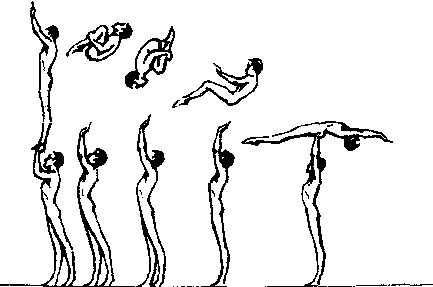 技巧双人抛接动作,双人项目一般难度动作之一。由“下面人”分腿立,两臂胸前屈,翻掌向上,“上面人”同向站其掌上开始,经向上推离后,“上”团身后空翻11/4周落至“下”上举手上成仰平衡造型。练习过程,“上”站手时须紧腰直立。“下”用力推起时应垂直向上发力。此时“上”身体应稍后倾,使重心稍后移。至推离瞬间,充分蹬直两腿,同时梗头、提气、领臂。腾起后迅速提膝、翻臀,抱腿团身后翻。当过1周时,两腿迅速向前下伸,两臂上领,上体后躺,展腰髋。与此同时,“下”迅速举臂,接托“上”腰两侧,经缓冲下蹲后成直立高举仰平衡。初学时可先使“上”在滑车保护带帮助下,练习原地后空翻1 1/4周成仰卧,以建立展体概念。熟练后利用滑车保护带帮助进行完整配合练习。