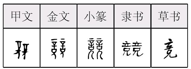 jìnɡ表意,甲骨文、金文下从二人,上从二言(或省),象二人言语相争之形,小篆字形稍变,隶定为“競”。本义表示纷争、争胜,引申为竞争。唐代俗字、《简化字表》简作“竞”,省略重复的部件。 |