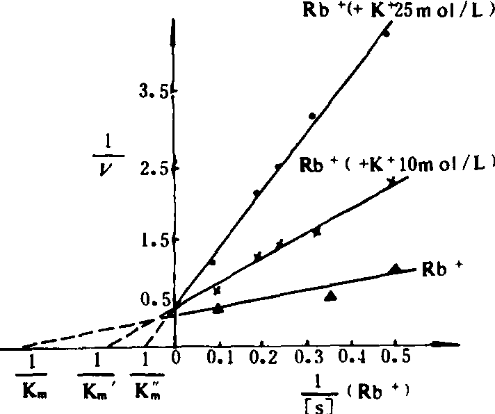 释义 | 竞争性抑制competitive inhibition性质相似的离子在进入植物细胞时所发生的离子间的颉颃作用。如K+与Rb+、Ca2+与Sr2+、SO2-4与SeO2-4,PO3-4与AsO3-4等。按载体学说解释,这是性质相似的离子彼此竞争同一载体的结合位置所致。当一种离子对另一种离子产生竞争性抑制时,另一种离子与载体的亲和力变小,但载体运载离子进入细胞的最大速率不变。 收速率;S为外部溶液中的离子浓度;Km为米氏常数。表达离子与载体亲和力的关系,按酶促反应动力学方程定义,Km值越大,亲和力越小,反之则大。用1/[S]对1/v作图,可得一直线,纵轴截距为1/V,斜率为Km/V,其外延线与横轴的交点为|1/Km|,由此可获得V和Km值。加入另一离子后,观测原有离子的V和Km值,即可判别离子间是否存在竞争性抑制。 爱普斯坦和C.E.哈根(Hagen)把大麦根吸收Rb+速率的倒数1/v,和Rb+浓度的倒数1/[S]作图,得到直线(1),其外延线与横轴的交点为|1/Km|。当Rb+溶液中加入K+后,再测Rb+的1/v和1/[S],得直线(2)和(3),各自外延线与横轴的交点为|1/Km′|和|1/Km″|(图)。结果表明,当加入K+后,Rb+的Km由小变大,Vmax值几乎不变,说明Rb+ 与K+之间存在竞争性抑制。