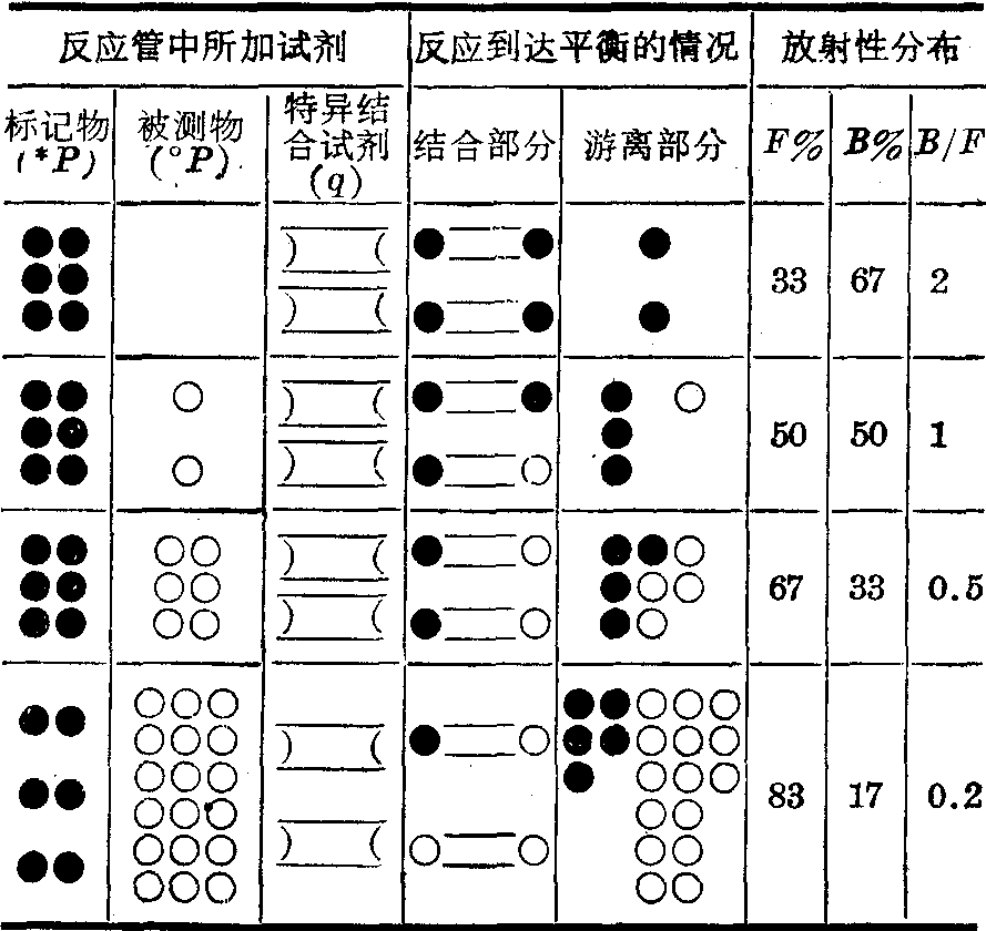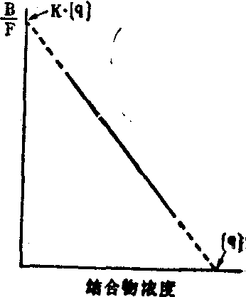 标准曲线斜率越高,同样量的放射性变化反映的°P的变化越小,所以在其他误差因素相同时,斜率越高,测量的精密度及灵敏度越高。但斜率越高,标准曲线可使用的范围往往越窄,故斜率选择在什么范围应视样品中被测物的含量而定。 特异结合试剂 竞争放射分析法中应用的特异结合试剂有:抗体、受体、血浆中的激素结合蛋白、酶、微生物等。根据所用特异结合试剂的种类,各类方法有不同的名称:放射免疫分析法、放射受体分析法、竞争性蛋白结合分析法、放射酶分析法、放射微生物分析法等。由于绝大多数特异结合试剂都是蛋白质,竞争性蛋白结合分析法有时也被广义地用于泛指各种竞争放射分析法。 对特异结合试剂的主要要求是平衡常数 (也称亲和常数)K要大。实验和计算表明,K越大,标准曲线的斜率越高。一般说,放射免疫分析法的K值大于或接近放射受体分析法,后者的K值又大于竞争性蛋白结合分析法(见“放射免疫分析”、“放射受体分析法和受体的放射分析”条)。K值通常通过实验求出,方法有好几种,最常用者为Scatchard作图法。其所依据的公式是,当反应达到平衡时,结合部分和游离部分的浓度比为结合物浓度的一次函数: 式中[q]为最初加入的特异结合试剂浓度。故若以B/F为纵坐标,〔结合物〕为横坐标作图,应得一直线,该直线延长至横坐标的交叉点即为[q],而斜率即等于一K。