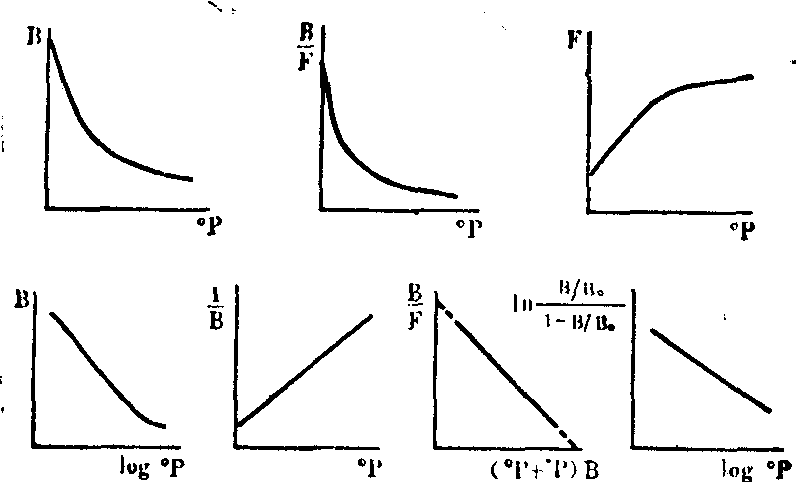 实践结果及数学推导都表明,若以°P为自变量(横坐标),结合部分的放射性(E)或游离部分的放射性(F)或二者的比例(B/F)为应变量(纵坐标)作图,都是曲线。提出过许多变换坐标以得到直线的办法,其中较常用者见图1。直线化可减小目测法作图的误差,并使数据处理便于计算机化,但并不提高测量的灵敏度及精密度。
