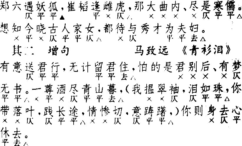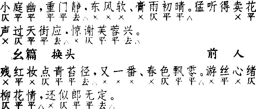 释义 | 端正好 端正好词牌名。双调五十四字, 上下阕各四仄韵。又曲牌名。一入北曲正宫套曲,字句格律与词牌异。一入北曲仙吕宫只曲,字句格律与正宫同,但第四句后可酌增三字句。参见“常用曲谱”类。 ☚ 浪淘沙 河传 ☛ 端正好 端正好马昂夫 散套 ![]() 前篇五句:3,3△,7△。7△,5△。幺篇四句:7△,7△。7△,5△。前篇首二句多作对语。首二句有叠用者,如吴昌龄《东坡梦》:“晚风轻,霜华重,云淡晚风轻,露冷霜华重。”亦有只叠首句者,如无名氏《飞刀对箭》。皆甚少见。幺篇第三句末三字字声可同前篇。本曲为套数首牌。幺篇换头,甚少用,仅见剧套、散套各二例。词牌略异。入〔仙吕〕作楔子,用法不同。 ☚ 正宫 滚绣球 ☛ 端正好 端正好关汉卿 《金线池》 ![]() 全曲五句:3,3△,7△。7△,5△。增句在第四句下,每句三字,必为双数,偶句叶韵,多作对偶。增句一般为六句和八句,增四句者极少,增十句者有孔文卿《东窗事犯》、无名氏《桃花女》,增十二句者有无名氏《罗李郎》。本曲单用时可增句;连用幺篇者只能在幺篇增句,而且幺篇必须增句。幺篇不增句者,仅见李文蔚《燕青博鱼》一例。词式与〔正宫〕全同。所不同的是:〔正宫〕用作套数首牌,〔仙吕〕只作楔子用;〔正宫〕用幺篇者极少,〔仙吕〕则常用幺篇;〔正宫〕不能增句,〔仙吕〕则多用增句,不增句者反而甚少见。《渑池会》、《千里独行》楔子题〔正宫〕,皆误;两曲均增句。 ☚ 仙吕宫 赏花时 ☛ 端正好 端正好又名《于中好》。见宋杜安世《寿域词》。《词律》卷七列此词(槛菊愁烟沾秋露),系于《于中好》下。《词谱》卷十列为正体,双调,五十四字,上、下片各四句四仄韵。前后结均作六字折腰句法。又列别体一种。 ☚ 箜篌曲 慢卷紬 ☛ 端正好 端正好词牌名。又名于中好。双调。始见于宋杜安世《寿域词》。 ☚ 浪淘沙 忆王孙 ☛ 端正好 端正好词牌名。又名《於中好》。双调。始见于宋·杜安世《寿域词》。 ☚ 浪淘沙 忆王孙 ☛ 端正好 端正好曲牌名。南北曲均属正宫。据清·周祥钰《九宫大成谱》,南曲之字数定格及韵式作七、三、四、七、三、三、七、三、四、七、三、三 (十二句)。北曲之字数定格及韵式作三、三、七、七、五 (五句),和词牌 〔端正好〕不同。一般用作正宫套曲的第一曲。如昆剧《长生殿·哭像》中唐明皇上场时所唱“是寡人昧了他誓盟深”一曲。又,北曲仙吕宫亦有 〔端正好〕,字数定格及韵式作三、三、七、七、三、三、三、三、五(九句)。用作小令,或用作杂剧的“楔子”,如元杂剧《金线池》的楔子。 ☚ 四门子 点绛唇 ☛ 《端正好》duan zheng haoJust Fine (sanqu)→刘时中 (Liu Shizhong) |