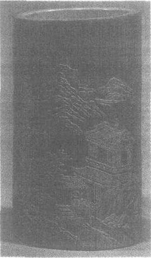 明代制品,现为上海博物馆收藏。筒高10.3厘米,直径5.9厘米。从筒底往上近刻二座山坡,一坡上刻有几株夹叶树,树干高耸,枝叶茂密; 另一坡上雕出垂柳欹石,柳枝纷披。两坡间陡斜的山道尽头是乱石堆就的高台,有二三十阶的石阶相通,高台上有屋三间,长窗上装有斜方格满天星式的内心子,另有夹堂板、裙板,有条不紊; 屋前装修半栏,栏干有绦环式的,也有横环式的。屋左侧有双层楼层,下层副檐飞椽出挑,上层阁楼突起,重檐歇山,正脊中间有葫芦式宝顶耸立。远处崇山叠岭,云气弥漫。