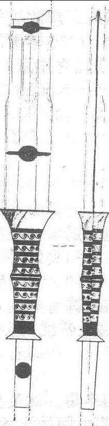 释义 | 竹节式柄铜剑战国末至两汉初兵器。1982年在吉林省舒兰县溪河乡征集。现藏吉林市博物馆。此剑为青铜质地合范铸造。剑身呈八棱形,中脊后部成椭圆形,剑叶扁薄,两刃锋利。剑身中部之前已残断不存。剑茎呈椭圆形竹节状,面饰以条带纹和卷云纹。剑格及茎端双角外层呈喇叭状,面饰放射状细弧线纹。茎后下连一圆柱体,末端稍残。全剑除局部有铜斑外,大部乌亮,可知其中含锡比重较大。剑残长29.9厘米,其中剑身长15.1、柄长14.8、茎后圆柱长5.2厘米、格宽4.2厘米。 竹节式柄铜剑 |