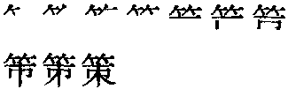 ❹出谋划策|缚手无策|谋无遗策|束手无策|万全之策|万世长策|袖手无策|运筹决策 策 金文; 篆cè[竹(意符)+朿(聲符)→策(《説文》:“策,馬棰也。從竹,朿聲。”策:1.馬鞭,竹制帶刺,用以趕馬前進〈馬策〉,引申爲鞭打督促〈鞭策、策動〉;2.書寫用的竹簡或木簡,通“冊”〈簡策〉;3.計算用的竹籌〈籌策〉,引申爲計謀〈策劃、策略、策動、上策〉。古代考試的一種文體,因書之於策〈竹簡〉,讓應試者作答也用策〈對策〉。)] [唐] 柳中庸《征人怨》:“歲歲金河復玉關,朝朝馬策與刀環。”(注:金河,即大黑河,在内蒙古境内呼和浩特市南。玉關:甘肅境内的玉門關。刀環:刀柄上的銅環。) 策筞;筴cè(12画)