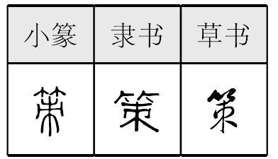 策Cè现行罕见姓氏。今河北之辛集、上海之文昌等地有分布。汉族姓氏。《续通志·氏族略》亦收载。归“入声”部。《姓氏考略》 注云: “古有策彊,策氏当为其后。” 明代有策敏,贺县人,成化中任长沙县丞。 策cè❶馬鞭。張衡《思玄賦》:“仆夫儼其正策兮,八乘攄而超驤。”傅毅《舞賦》:“擾躟就駕,仆夫正策。” ❷策書。舊時命官授爵封土,用策書爲符信。張衡《西京賦》:“乃爲金策,錫用此土,而翦諸鶉首。” ❸射策和對策,爲漢代考試擇士的方式。揚雄《解嘲》:“策非甲科,行非孝廉。” ❹策略,計謀。杜篤《論都賦》:“即日車駕,策由一卒。” 策 策即策书。皇帝命令的一种,多用于封土授爵、任命三公。这里则指宣布废立皇帝的策文。 ☚ 朔 否德 ☛ 策cè扶。王梵志《心恒更愿取》:“行时头即低,策杖共人语。” 策读音c·e(ˋ),为e韵目,属e—ie—üe韵部。楚革切,入,麦韵。 ❶古代赶马用的棍子,其一端有尖刺,可刺马。如:策马前进。 ❷计策;计谋;主意。 上一条: 茦 下一条: 筞 策〔ce〕 策划〔ce hua〕 jid blongl joutyib; jid beat zhut yib. 策筞、筴{}四6189①名树木的细枝。冀鲁官话。河北。清光绪十二年《顺天府志》:「木细枝谓之杪,燕之北鄙谓之~。」②动搀扶。⑴中原官话。山西运城〖 〗。王雪樵《河东方言语词辑考》:「搀扶,运城谓之~。」⑵官话。元吴昌龄《张天师》楔子:「强扶~恹恹病里身,空凝望盈盈月下人。」《杨家将演义》第五回:「可怜打得他皮开肉绽,鲜血迸流,帐下见者无不酸鼻,仁美令府门外从人即~之去。」⑶吴语。《警世通言・皂角林大王假形》:「人从扶~知县归到县衙,明日依旧判断公事。」   策ce❶竹制的马鞭。同义合成词:“鞭策”。韩愈《马说》:“执~而临之。”(临:面对。)贾谊《过秦论》:“振长~而御宇内。”(振:挥动。御宇内:驾驭天下。) ❷帝王封臣下。《三国志·蜀书·诸葛亮传》:“先主于是即帝位,~亮为丞相。”(先主:这里指刘备。) ❸帝王给臣下记(功)。《木兰诗》:“~勋十二转,赏赐百千强。”(勋:功劳。转:指升迁官职。) 策*筞筴cè❶马鞭 △ 长~。 ❷用鞭子赶 △ 扬鞭~马|鞭~。 ❸计划;谋划 △ ~划|~应。 ❹谋略;计策 △ 出谋划~|下~。 ❺姓。 【注意】下边是“朿(cì)”,不是“束(shù)”。以“朿”为偏旁的字还有“刺、棘、枣”等。 策筞、䇲古代的马鞭子:马~。 ❷用策赶马:~马︱驱~︱鞭~。 ❸促进;促动:~动︱~励︱~源地。 ❹计谋;办法:~略︱~士︱计~︱政~︱国~︱善~︱上~︱中~︱下~︱献~︱对~︱失~︱群~群力︱束手无~︱运筹决~︱出谋划~︱万全之~。 ❺古代用竹片或木片记事,成篇的叫“策”:史~︱简~。 ❻古代考试的一种文体:~问︱~论︱对~。 策cè❶ 古代用来写字的木片或竹简:简策。 ❷ 古代考试的一种文体,多是就国家的政治、军事、经济等大事提出问题,应试者回答:对策|策问。 ❸ 计谋:上策|献策|出谋划策。 ❹ 古代赶马用的鞭子。 ❺ 用策赶马:策马飞驰。 策(3次) ❶古代占卜用的蓍草。詹尹乃释~而谢曰龟~诚不能知事《卜》 ❷本指马鞭。此处用如动词,指策马(用鞭赶马)。~驽骀而取路《辩·五》 另见[端策][强策][枉策][正策] 策cè❶ 古代占 卜用的蓍草。《 卜居》:“詹尹乃释策而谢曰:龟策诚不能知事。” ❷ 名词,马鞭子。《七谏·谬谏》:“驾蹇驴而无策兮,又何路之能极?” ❸ 动词,用马鞭子赶马。《九辩》:“策驽骀而取路。” ❹谋略,计划。《九思·守志》:“斥蜥蜴兮进龟龙,策谋从兮翼机衡。”汤炳正今注:“策谋从,指国君听从贤良之士的策谋。” 策ce策动 策反 策府 策划 策进 策励 策略 策论 策马 策勉 策谋 策士 策问 策应 策杖 鞭策 对策 方策 国策 划策计策 警策 决策 良策 妙策 驱策 上策 失策 下策 献策 政策 中策 策源地 土政策 策马飞舆 策马前进 策名委员 策弩砺钝 策顽磨钝 群策群力 斗争策略 幕后策划 出谋划策 谋无遗策炮舰政策 束手无策 鸵鸟政策 万全之策 愚民政策 策❶簡也。《儀禮·聘禮》: “若有故則卒聘,束帛加書將命,百名以上書於策,不及百名書於方。” 鄭玄注: “策,簡也。”《儀禮·既夕禮》: “書遣於策。” 鄭玄注:“策,簡也。” 《禮記·中庸》: “子曰: 文武之政,布在方策,其人存,則其政舉;其人亡,則其政息。”鄭玄注: “策,簡也。” 陸德明 《經典釋文》: “方策,初革反。” ❷謀也。《禮記·仲尼燕居》: “田獵事失其策。” 鄭玄注: “策,謀也。” 陸德明《經典釋文》: “策,初革反。” ❸馬捶也。《春秋傳服氏注九》: “左師爲己短策,過華臣之門必騁。” 注: “策,馬捶也。”(《鄭氏佚書》) 古代名物 > 日用類 > 起居部 > 什物 > 杖 > 策 策 cè 亦作“莢”,即杖、拐杖。杖、策常連文。《莊子·齊物論》:“師曠之枝策也。”郭璞注:“策,杖也。”《淮南子·墜形訓》:“夸父棄其策。”高誘注:“策,杖也。”唐·魏徵《述懷》詩:“杖策謁天子,驅馬出關門。”清·王韜《淞濱瑣話,李延庾》:“生於讀書之暇,杖策出游,信足所至。”