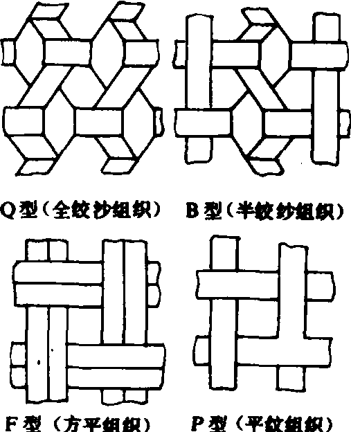 圆筛 有振动圆筛、打板圆筛和农用小圆筛等。 振动圆筛 主要工作部件是一个振动的圆筒形筛体,上钉筛网。偏心距为2毫米的偏心轴,带动与筛体相连的振动器,以每分2 500次的频率振动,抖落堵塞筛孔的物料。筛筒中间有一对稍有斜度的旋转打板,打击进入的物料,小于筛孔的颗粒穿过筛孔成为筛出物。具有筛理作用强烈,对筛理质轻、粒小、湿粘或成团结块的物料有良好的筛理效果。在大中型面粉厂一般作为辅助筛理设备使用,专门处理吸风粉、刷麸打麸粉等物料。 打板圆筛 主要工作部件是一个旋转的圆形筛体,转速较慢,筛体内有高速转动的打板,筛体与打板作同向转动,一般筛体的转速为打板转速的1/10。物料通过打板打击并穿透转动的筛网。 农用小圆筛 与小型磨粉机配套的筛粉机。主要工作部件是钉有筛网的筒体。物料进入筒体内,被主轴上装有两块带有毛刷的刷板打击,抛向筛面,并经毛刷拍打、擦刷使面粉通过筛网而排出,颗粒大的物料,如麸皮则从筛面上排出。这种圆筛结构简单,生产率不高,分级很小,经济指标与效益低于小方筛。 筛粉机常用的筛面材料,有金属丝筛网、合成纤维筛网和蚕丝筛网,前者用于分离较粗的物料;后者用于分离较细的物料。筛网按筛孔大小不同编织而成,供不同的工艺要求选用。金属丝筛网有黑低碳钢丝网和铜丝网,前者筛孔为11~20孔/厘米,后者筛孔为3~79孔/厘米。合成纤维和蚕丝筛网的型号规格见表2及图2。 图2 筛网组织类型 表2 合成纤维和蚕丝筛网的型号及规格