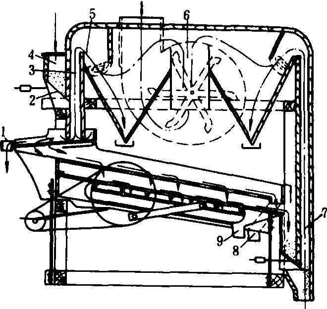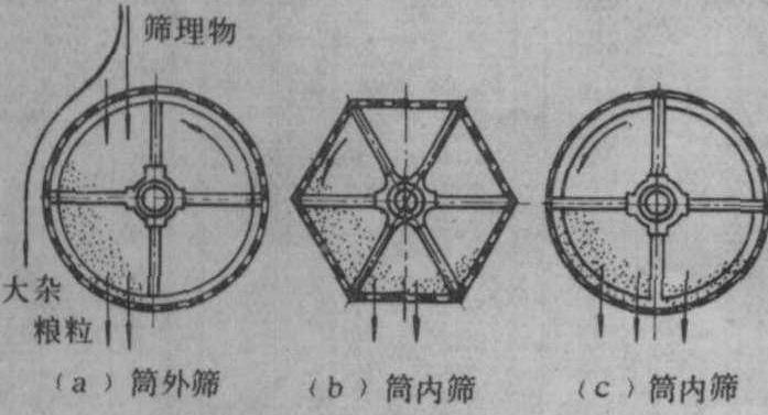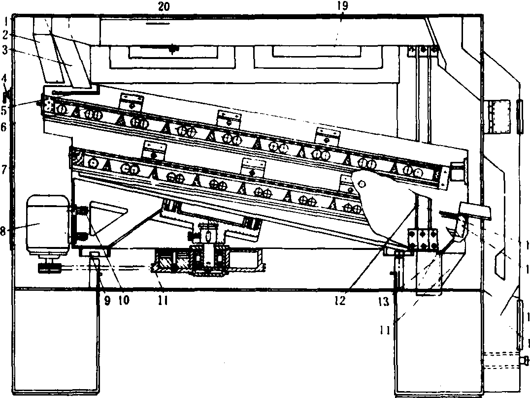 释义 | 筛选设备screening equipment根据粮食颗粒与杂质几何尺寸的大小,利用筛面进行清理和分级的设备。为了同时能除去轻杂质,筛选设备多配备有吸风装置。 图1 振动筛的工作过程 1.大杂出口; 2.压力门; 3.进口吸风道; 4.进料斗;5.风量调节活门; 6.风机; 7.出口风道; 8.中杂出口;9.小杂出口 类型与结构 常用的筛选设备有振动筛、高速振动筛、平面回转筛、筒筛和溜筛。 振动筛 筛面作往复运动的一种筛选设备,常与风选相结合。它是粮食加工厂中普遍使用的一种清理设备,通常放在初清筛后面,用以清除粮食中的大、小杂质和轻杂质。振动筛主要由进料斗、筛体、吸风装置和振动机构等部分组成。典型的振动筛结构和工作过程如图1所示,筛体传动有曲柄连杆机构和自衡振动机构两种形式。振动筛工作时, 粮粒由进料斗经压力门均匀分布于筛面,经过前吸风道吸去轻杂质及灰尘然后进入第一层筛面,未通过筛孔的大杂由出口排出。穿过筛孔的物料继续由第二层筛面筛理, 从第二层筛面上分离出中杂, 由出口排出; 粮粒由第三层筛面上排出, 经后吸风道再次吸出轻杂。第三层筛下的小杂, 沿底板下滑至出口排出。由风道吸出的轻杂经活门进入沉降室, 当积聚到一定重量后, 自动压开活门排出机外。 由于振动筛的筛面是作往复运动的,物料颗粒在沿筛面作上下相对滑动的过程中穿过筛孔,得到分离,所以筛面振动频率不能过快,以免物料跳离筛面,减少与筛面接触的机会,降低筛理效果。振动筛的筛面倾角一般为5°~10°,筛架主轴转速为450~650转/分,振幅为5~6毫米左右。 高速振动筛 筛体振动频率较高而振幅较小的一种筛选设备。主要由进料装置、筛体及振动器、吸风装置及传动等部分组成。筛体分主筛和副筛,主筛有一层大杂筛面和两层小杂筛面,副筛装在主筛出料端底板下方,使小杂筛面的筛下物得以继续清理。整个筛体由4组刚度相等的螺旋弹簧支承在机架上。筛体振幅为1.5~2毫米, 振动器主轴转速为1 400~1 500转/分,筛体在垂直面作近似的圆形运动,筛面上的物料是在沿筛面跳跃翻滚的状态下进行分选的,所以筛孔不易堵塞。用于粮食加工厂的稻谷除稗和清除小麦杂质等作业。 图2 平面回转筛 1.机架; 2.吸风管道; 3.进料斗; 4.检修门; 5.缓冲淌板; 6.上层筛面; 7.下层筛面;8.电动机; 9.调节螺栓; 10.限振装置; 11.传动轮; 12.吊杆; 13.小杂管; 14.大杂管;15.出料口; 16.检查窗; 17.平衡重块; 18.把手; 19.观察窗; 20.调风门 筛体振动由安装在传动轴两端的可移式自动平衡振动器产生。当传动轴转动时,振动器内安装的偏心重块甩开,产生离心惯性力,使筛体作高速振动。此外,这种振动器还可消除筛体在启动及停车过程中的共振现象。电机启动时,由于传动轴转速较低,偏心重块没有甩开,对筛体不产生激振力。当传动轴转速超过筛体共振转速区后,偏心重块的离心力矩克服了其拉力弹簧的拉力矩后而向外甩开,达到正常工作状态,产生激振力,使筛体高速振动。同理,机器停车时,也可以消除筛体的共振。 平面回转筛 筛面作水平回转运动的一种筛选设备。它是物料相对于筛面作近似摆线的下滑运动,而实现物料与杂质的分离。物料在回转筛面上的筛理流程较长,筛选效率较高,除杂效果好。通常用于粮食清理的平面回转筛,只有两层略带倾斜的筛面,其筛面倾角为8°,筛面回转直径为14毫米,转速400转/分。以分离粮食中的大、小杂质;轻杂质由吸风装置分离。 平面回转筛的结构如图2。粮食从进料口进入上层筛面,大杂、轻杂通过筛面流入大杂出口,粮食及小杂穿过筛孔进入下筛。粮食经过下筛筛面从出口排出,再经过一次风选;小杂穿过下筛筛孔从小杂出口排出。 筒筛 筛筒作等速旋转运动的一种筛选设备。筒筛的筛面呈圆筒形或六角形(图3)。筛筒与水平面呈3°~10°倾角,筛面多为金属丝编织的方孔筛网。筒筛按用途分筒外筛理和筒内筛理两种筛理方式。筒外筛理时,筛理物落在筒筛的外表面上,粮粒穿过筛孔下落,大杂则沿筒筛表面下滑而分离;筒内筛理时,筛理物进入筛筒,粮粒穿过筛孔下落,大杂则留在筒内,随筛筒旋转而排出。筒筛通常都配有吸风装置。在大型粮食和饲料加工厂里筒筛用作除去粮食中大杂和轻杂的初步清理设备。筒筛工作时应使物料产生的离心力小于其自身的重力,所以其转速不能过快,一般为10~25转/分。 图3 筒筛的筛理方式 溜筛 筛面静止不动的一种筛选设备。筛面与水平面呈32°~40°倾角,多为编织方孔筛面,宽0.8~1.1米,长1.5~2米。工作时,物料由筛的顶部喂入,靠物料自重沿筛面下滑进行分选。溜筛结构简单,制造方便,造价低,不需要动力,曾广泛用于稻谷除稗和谷糙分离。但其分离效率较低,而且需要安装多层筛面,占据空间大,在生产中已逐渐被高速振动筛和平面回转筛所取代。 |