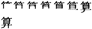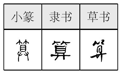 【提示】目中间的横,宋体与左右两边相接,楷体与左边相接,与右边相离。下面是廾,第二笔是竖撇,不是竖,不要错写成什。 *算suàn14画 竹部 (1) 计算数目: ~账|心~|~~总共多少人。 (2) 谋划;计划: 打~|~计|神机妙~。 (3) 推测: 我~着他该到家了。 (4) 认为;当作: 五元钱一斤不~贵|王大妈真~是个热心人。 (5) 作数,承认有效: 说话~数儿|可别说了不~。 (6) 作罢,不再计较(后面加“了”): ~了,你别去了|~了吧,别再提这件事了。 (7) 终于;总算: 这件冤案~是翻过来了|我~把你看透了。 算 ☚ 筭 笑 ☛ 算suàn小篆以来有祘字。从两示,会意。两个显示(或说小篆四横六直象筹码),可以查算。又有筭字(可能是较后的小篆)。汉隶常用。从竹从弄。《说文》说长六寸,用来计算历数。说常弄才不错误。两个都指名词,是物件。算也是小篆中的会意字。从竹,下从具,具数义,隶楷变形。计数义。是动词。后三字通用。现以算为规范字。见《通用字表》。核计,计数义。现代例如:算算多少钱|算账。引申为打算,计划。如:失算|打算。中古又引申为推测。如:算他该来了。又指作为,当作。如:这个算我的。又引申为作数,承认。如:不能说了不算。又为作罢,休再提起。如:算了,不再啰嗦了。又为总算。如:这问题算弄清楚了。 算★常◎常